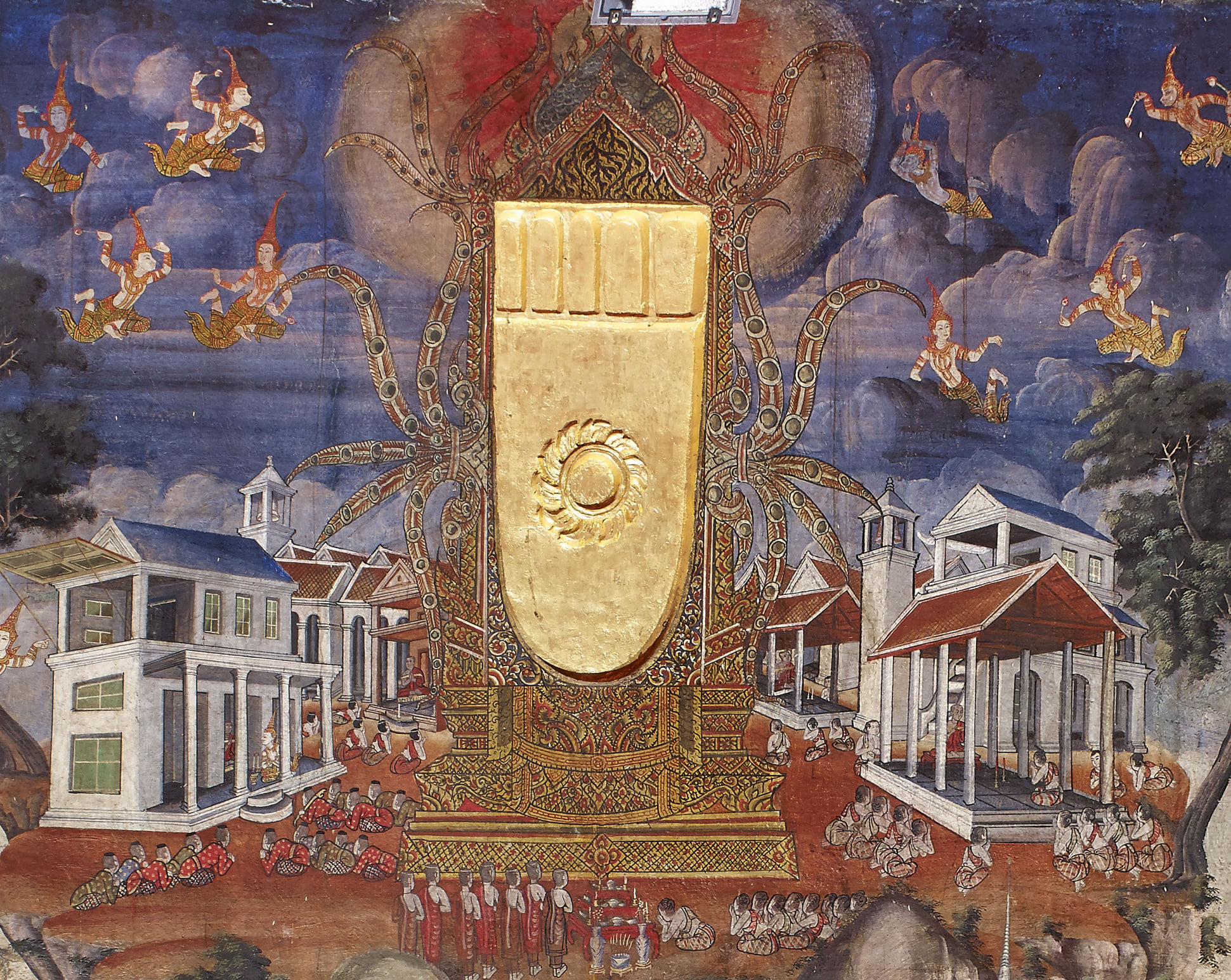 ๕. ยังคงมีการเขียนตัวภาพแบบประเพณีอยู่ คือ ภาพเทพชุมนุม นักสิทธิวิทยาธร โดยเขียนเครื่องทรงอาภรณ์ มีชฎาผ้านุ่งตัดเส้นแบบไทยประเพณี และมีการเขียนคั่นภาพด้วยเส้นสินเทา