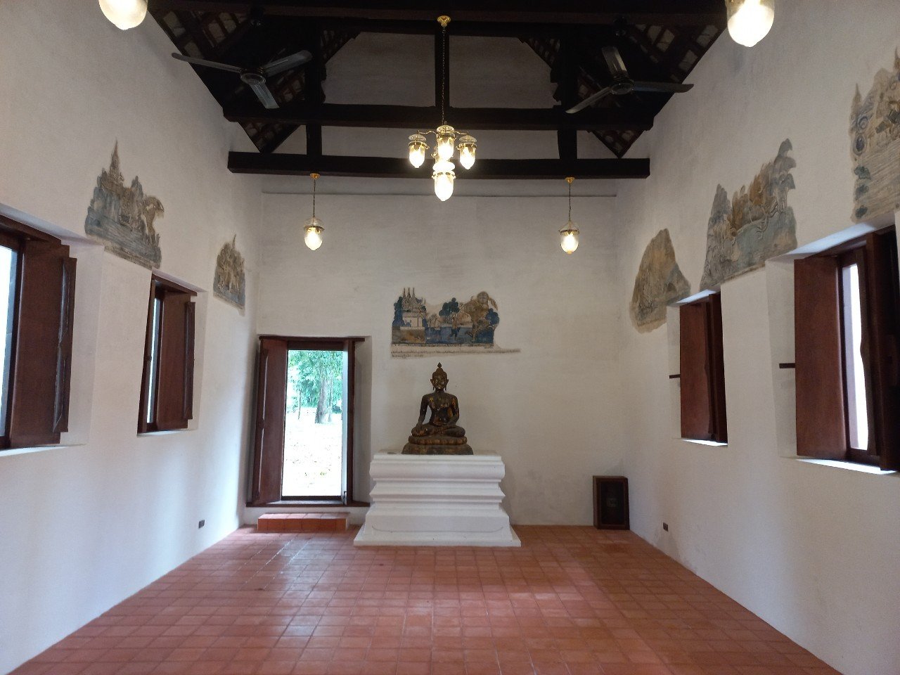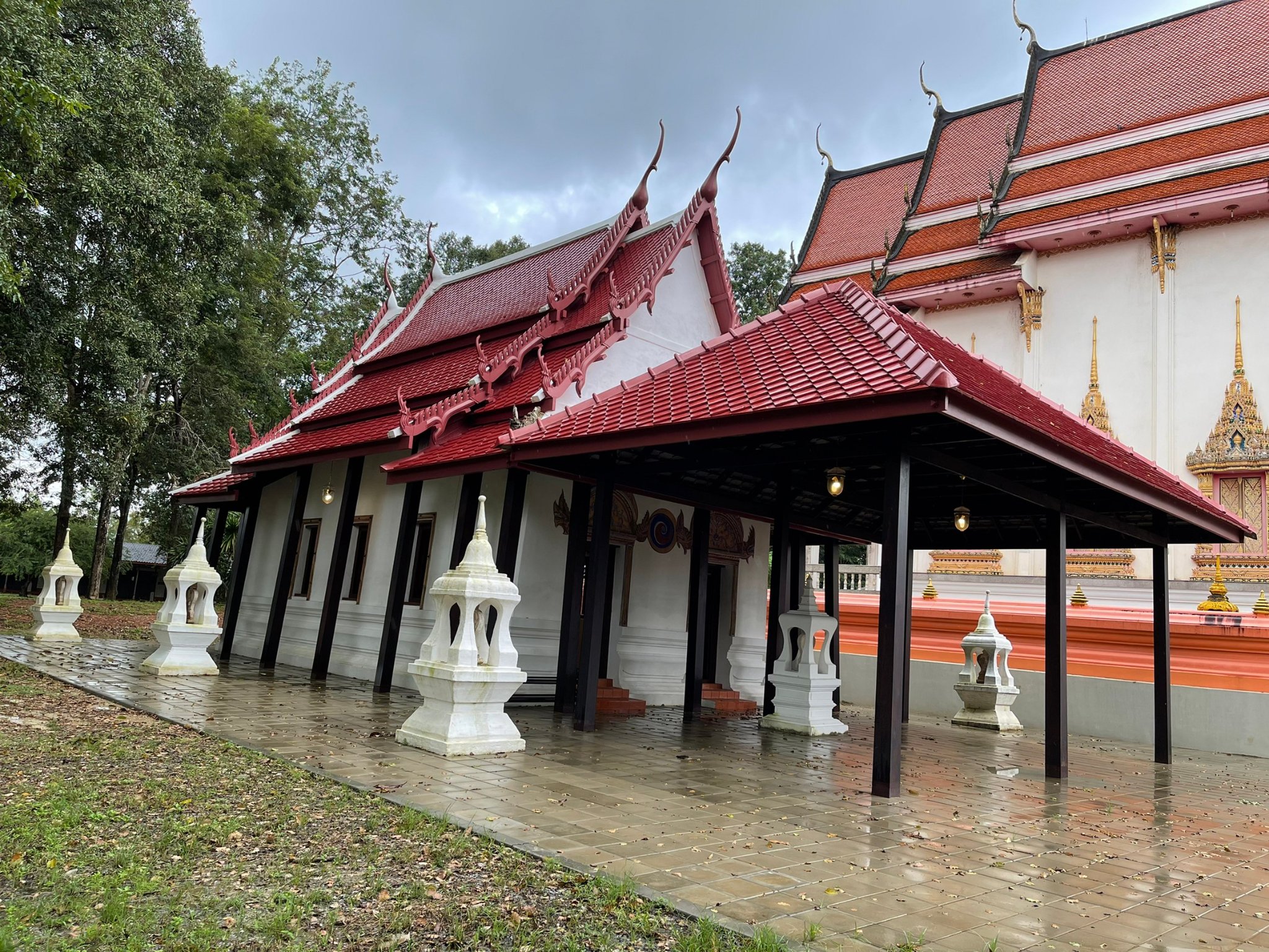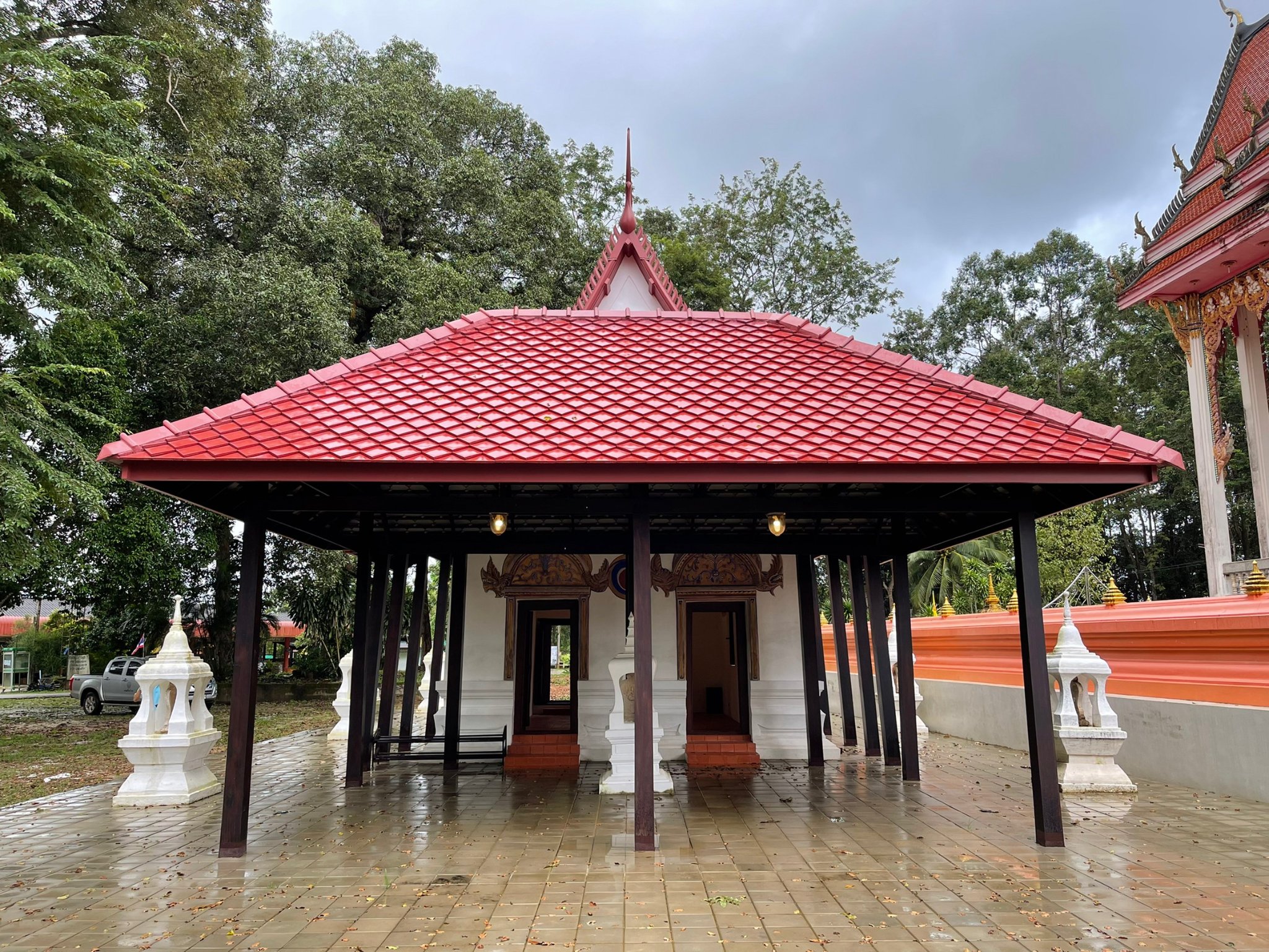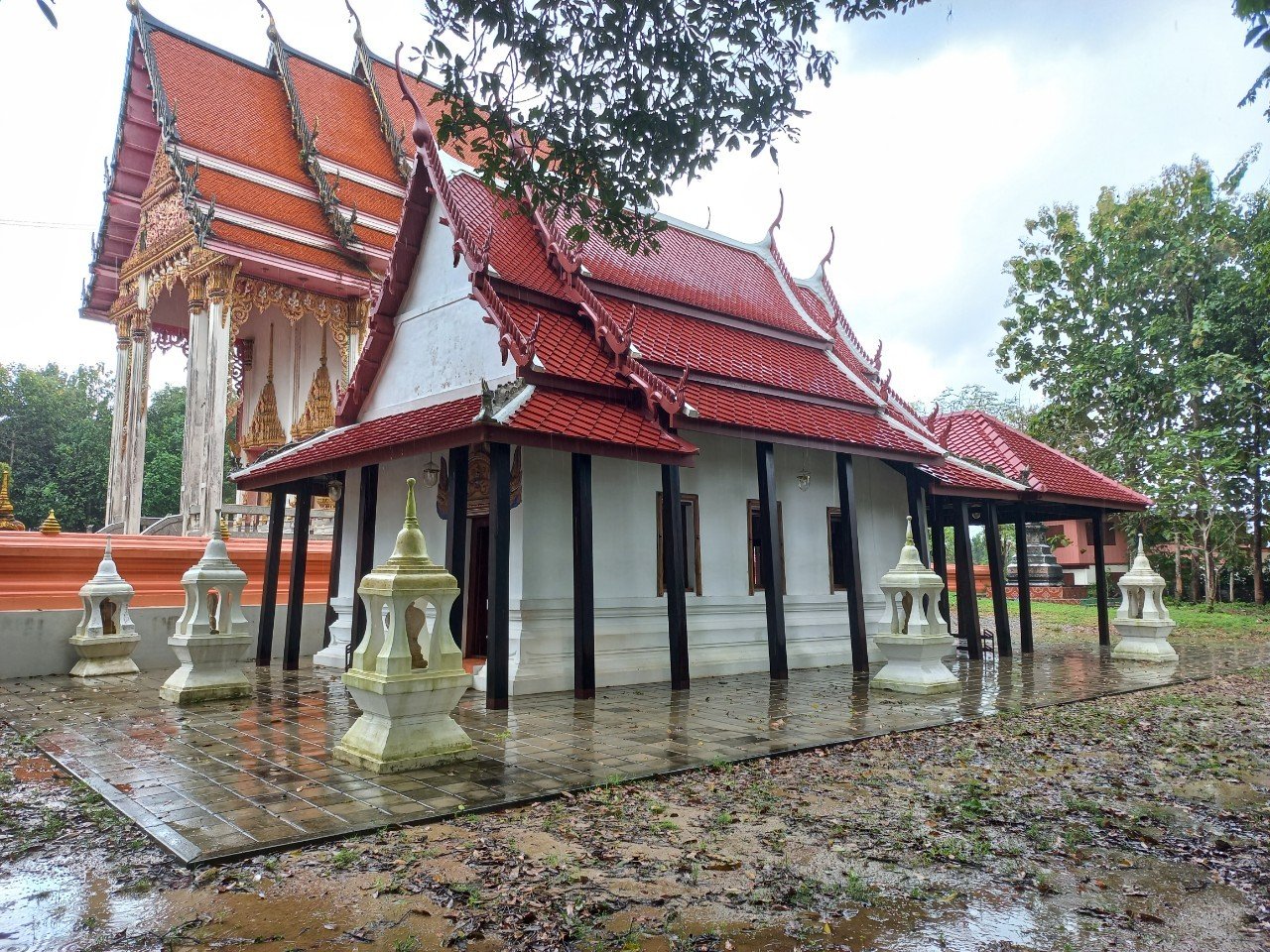 ด้านหน้าอุโบสถมีศาลาเครื่องไม้ อันเป็นลักษณะเฉพาะของอุโบสถในอำเภอแกลง ที่สร้างราวกลางพุทธศตวรรษที่ ๒๕ หรือในรัชกาลพระบาทสมเด็จพระจุลจอมเกล้าเจ้าอยู่หัว พบได้หลายวัด เช่น วัดจำรุง วัดหนองแพงพวย วัดเนินยาง วัดโพธิ์ทองพุทธาราม