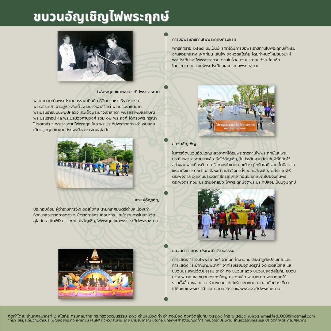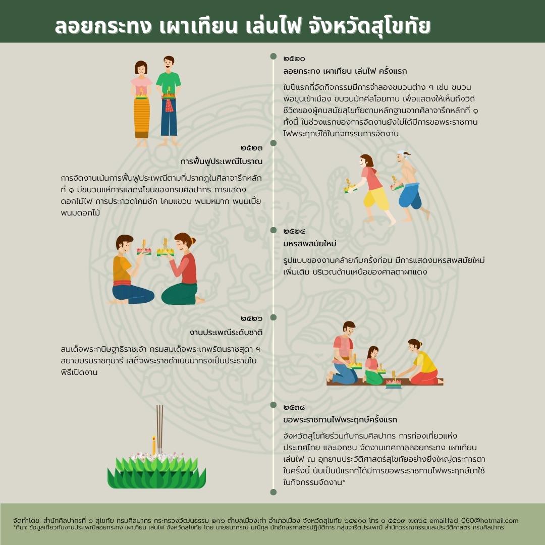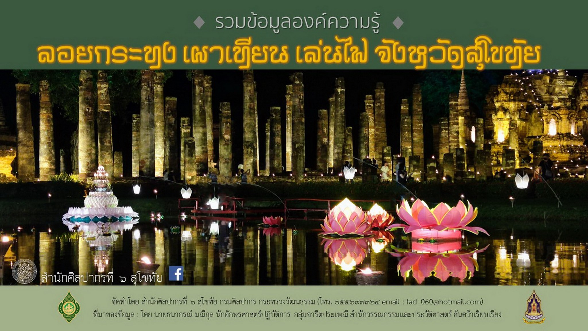 ข้อมูลเกี่ยวกับงานประเพณีลอยกระทง เผาเทียน เล่นไฟ จังหวัดสุโขทัย โดย นายธนากรณ์ มณีกุล นักอักษรศาสตร์ปฏิบัติการ กลุ่มจารีตประเพณี สำนักวรรณกรรมและประวัติศาสตร์ ค้นคว้าเรียบเรียง