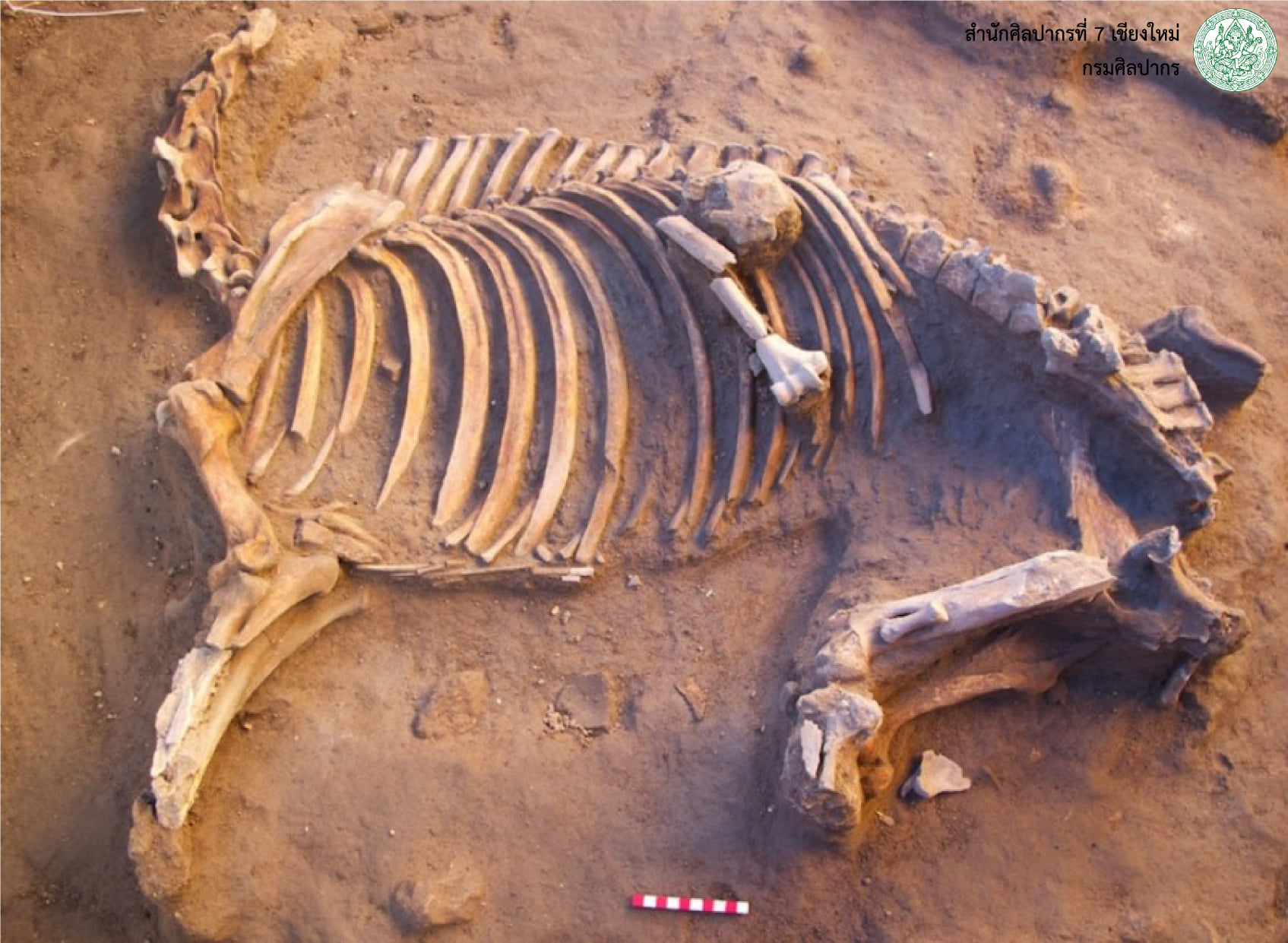 หลักฐานทางโบราณคดีอันโดดเด่นอีกชิ้นหนึ่ง คือ โครงกระดูกม้า ซึ่งถือเป็นการค้นพบโครงกระดูกม้าที่สมบูรณ์ที่สุดเท่าที่เคยมีในประเทศไทย และม้าไม่ใช่สัตว์ที่มีถิ่นกำเนิดในประเทศไทย นักวิชาการสันนิษฐานว่ามีการนำเข้าม้ามาในสมัยทวารวดี และปรากฏเรื่องราวในเอกสารจีนสมัยราวงศ์ถัง (พ.ศ.๑๑๖๑ – ๑๔๕๙) ว่าทูตทวารวดีเคยขอม้าพันธุ์ดีจากจีนแลกกับงาช้างและไข่มุก ซึ่งในช่วงก่อนพุทธศตวรรษที่ ๑๙ นั้น ม้าถือเป็นสัตว์สำคัญที่มีการควบคุม ไม่สามารถซื้อขายได้อย่างเสรี โครงกระดูกม้าโบราณ