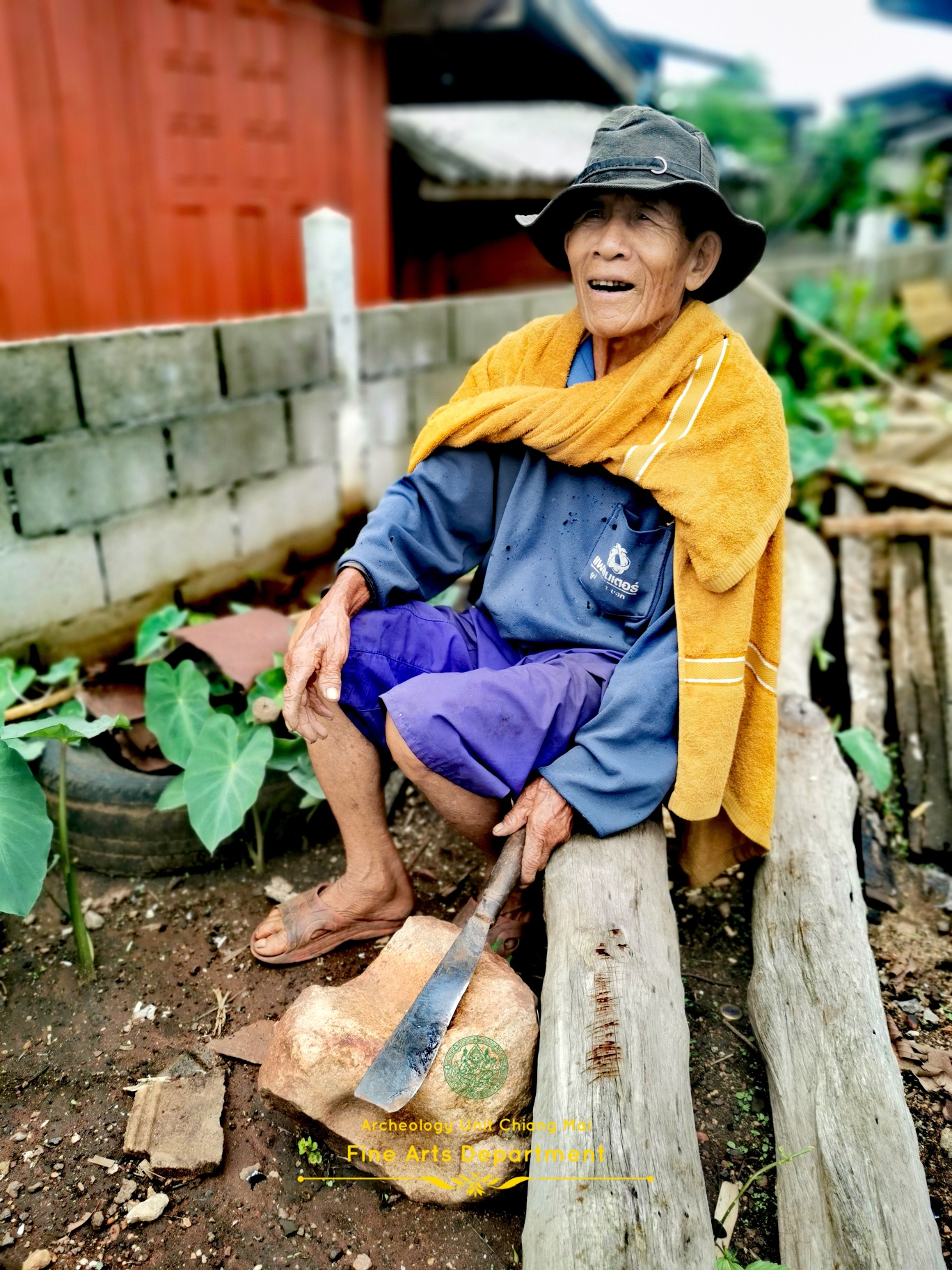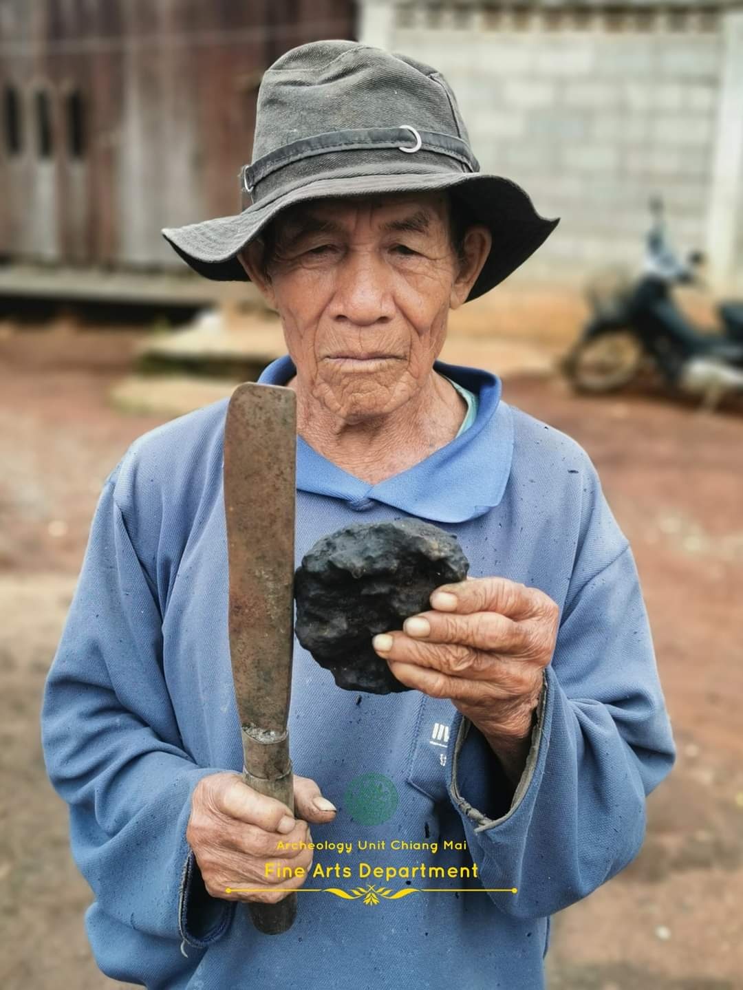 - ภาพประกอบภาพแรก คุณลุงเปี้ย อายุ 90 ปี ทายาทตระกูลถลุงเหล็ก ลัวะบ้านบ่อหลวง ที่อยู่ร่วมในกระบวนการถลุงเหล็กแบบโบราณครั้งสุดท้ายเมื่อราว 80 ปีมาแล้ว ส่วนในมือที่ถืออยู่ คือ ก้อนโลหะเหล็ก (Iron Bloom) ผลผลิตที่ได้จากการถลุง และมีดที่ตีขึ้นจากเหล็กถลุงแบบโบราณ