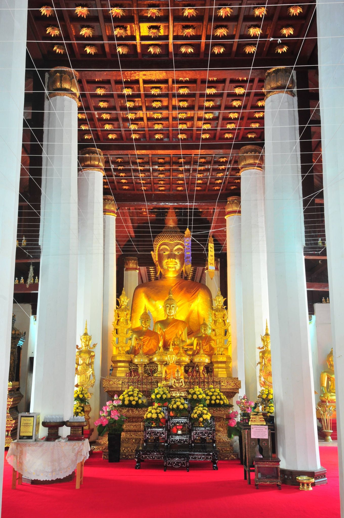 นอกจากองค์พระธาตุแล้วยังปรากฏวิหารหลวงสันนิษฐานว่าสร้างขึ้นในสมัยพระยาหน่อเสถียรไชยสงคราม ราวปี พ.ศ.2138 ที่ปรากฏในปัจจุบันนั้นสร้างขึ้นในสมัยเจ้าสุมนเทวราชเป็นเจ้าผู้ครองเมืองน่าน ในปี พ.ศ.2363 วิหารหลวงมีแผนผังเป็นรูปสี่เหลี่ยมผืนผ้า หลังคาสร้างด้วยไม้ลดหลั่นกัน 3 ชั้น หรือเรียกว่า “ซด” ด้านหน้าวิหารเป็นผนังเรียบ ปรากฏลวดลายปูนปั้นรูปพญานาคประดับทางเข้า โดยเป็นพญานาคเกี้ยวกระหวัดหางขึ้นพันกัน 3 ชั้น เป็นสัญลักษณ์แทนไตรลักษณ์ ประกอบด้วย การเกิด การตั้งอยู่ และการดับสลาย ที่บริเวณสันหลังคาของวิหารปรากฏลวดลายปูนปั้นเป็นรูปพญานาคด้วยเช่นกัน ส่วนโครงสร้างภายในวิหารนั้นประกอบด้วย ตอนบนเป็นโครงไม้ ไม่มีฝ้าเพดาน เสารับน้ำหนักของชั้นหลังคาเป็นเสาเหลี่ยม มีบัวหัวเสาเป็นปูนปั้นรูปดอกบัวตูม ภายในวิหารประดิษฐานพระเจ้าล้านทอง โดยตามตำนานพื้นเมืองน่านระบุว่าสร้างขึ้นเมื่อปี พ.ศ. 2065 ในรัชสมัยพญายอดคำฟ้า ความว่า “….ในปีเต่าสง้านั้น สักกพทได้ 884 ตัว (พ.ศ.2065) เจ้าวัดแช่แห้งชื่อธัมมเสนาแล เถรปาสุรสีลแล มหาสังฆราชาสุรสีลาสรีบุญเรืองแลสังฆะชปะสีลประหยาแล พระญายอดคำฟ้า หมื่นซ้ายธัมมประหยา ส้างพระเจ้าล้านทองแล…” พระเจ้าล้านทองมีลักษณะทางพุทธศิลป์ที่ยังคงสืบเนื่องจากพระพุทธรูปอิทธิพลศิลปะสุโขทัยหมวดใหญ่ ระยะที่ 2 หากแต่มีความเป็นพื้นถิ่นมากยิ่งขึ้น เป็นพระพุทธรูปปูนปั้น พระพักตร์กลม พระขนงโก่ง พระเนตรเหลือบต่ำ พระนาสิกโด่ง พระหนุเป็นปม ขมวดพระเกศาเล็ก มีกรอบไรพระศก พระรัศมีเป็นเปลว พระวรกายอวบอ้วน ครองจีวรห่มเฉียง ชายสังฆาฏิตกลงเสมอพระนาภี ปลายแตกเป็นเขี้ยวตะขาบ ประทับนั่งขัดสมาธิราบแสดงปางมารวิชัยเหนือฐานบัวคว่ำ – บัวหงาย กำหนดอายุปลายพุทธศตวรรษที่ 21