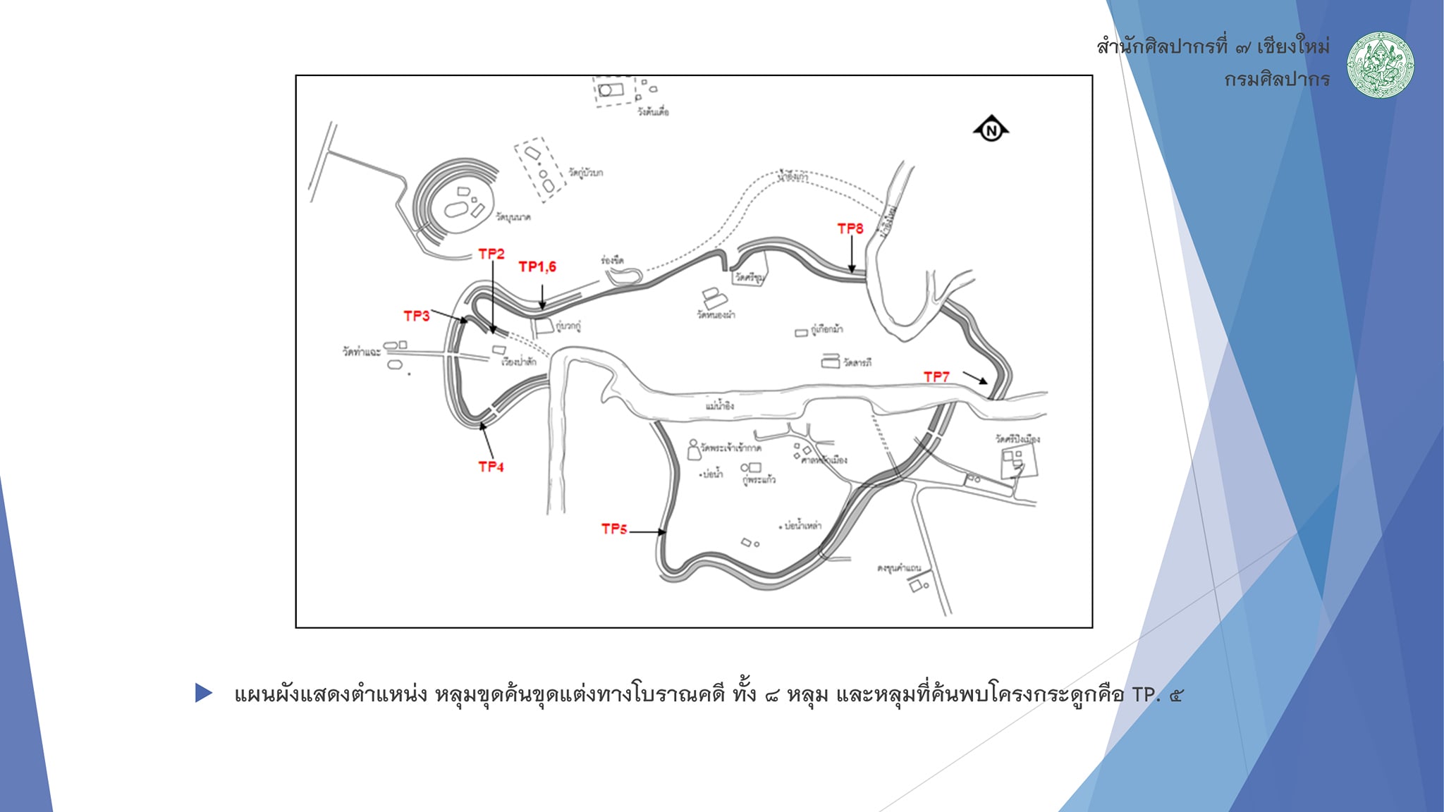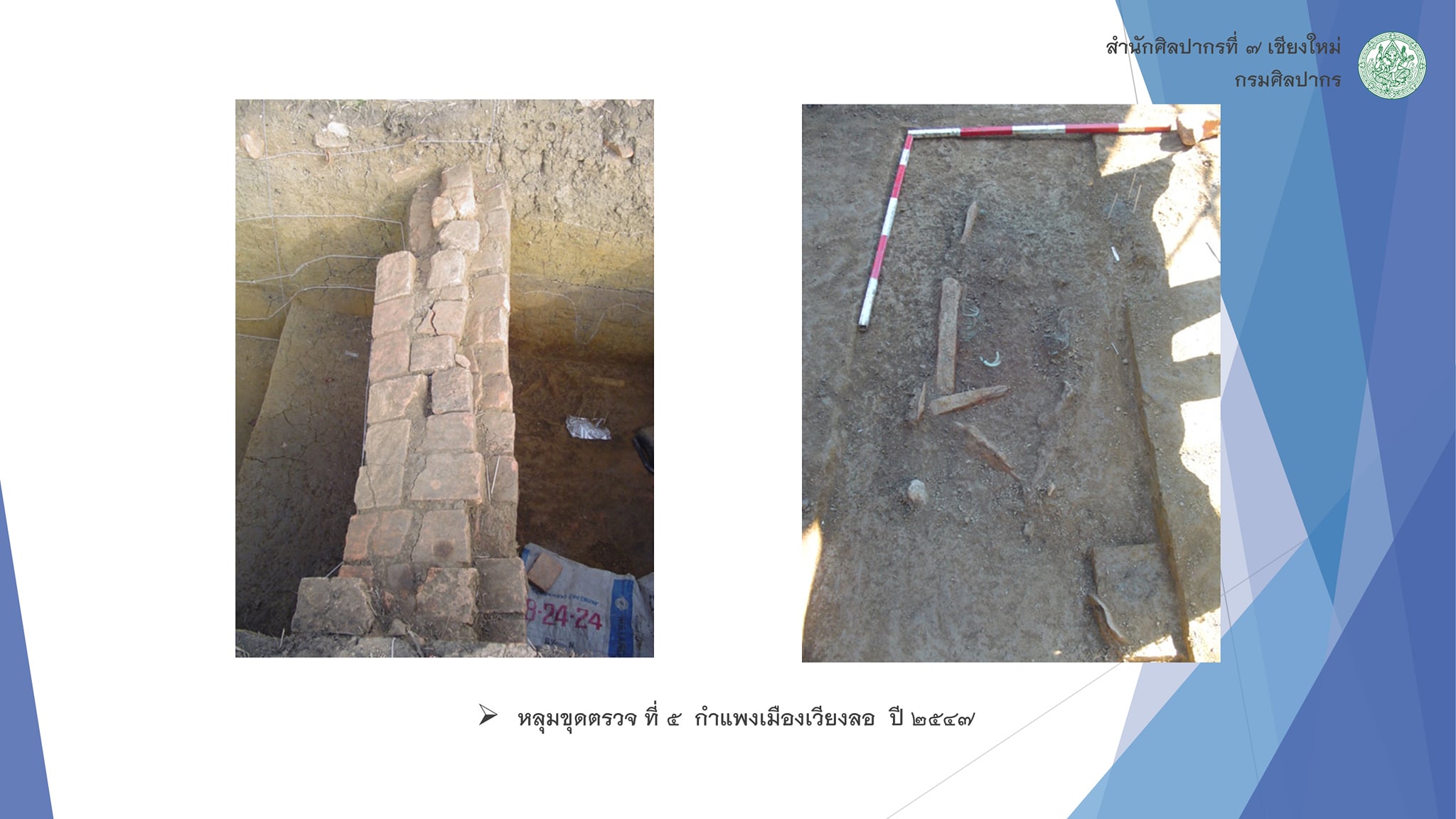 . ดังที่ทราบว่า ใน ปี พ.ศ. 2547-48 สำนักศิลปากรที่ 7 น่าน(ขณะนั้น) ได้ดำเนินทางโบราณคดี ขุดแต่งโบราณสถาน ขุดแต่งโบราณสถาน 14 แห่ง ขุดค้นทางโบราณคดีทั้งในและนอกกำแพงเมือง 19 จุด และขุดค้นขุดแต่งเพื่อทราบโครงสร้างการซ่อมแซม เสริมสร้างแนวกำแพง และขนาดของกำแพงเมือง จำนวน 8 จุดครอบคลุมทุกด้านของแนวกำแพงเมืองเวียงลอ ในการทำงานจะมีการขุดค้นลึกลงไปจนเลยพื้นใช้งานแรกสุดของกำแพงเมืองเพื่อให้ทราบถึงว่าไม่มีร่องรอยกิจกรรมของมนุษย์อีกในพื้นที่นี้ หลุมขุดค้นอื่น ๆ ไม่มีปรากฏร่องรอยกิจกรรมมนุษย์ก่อนการสร้างกำแพงเมือง แต่การดำเนินงานไปจนกระทั่ง หลุมที่ 5 (T.P.5) ตั้งอยู่ในบริเวณ ทางแนวกำแพงเมืองพื้นที่ทิศตะวันตกเฉียงใต้ แตกต่างออกไป
