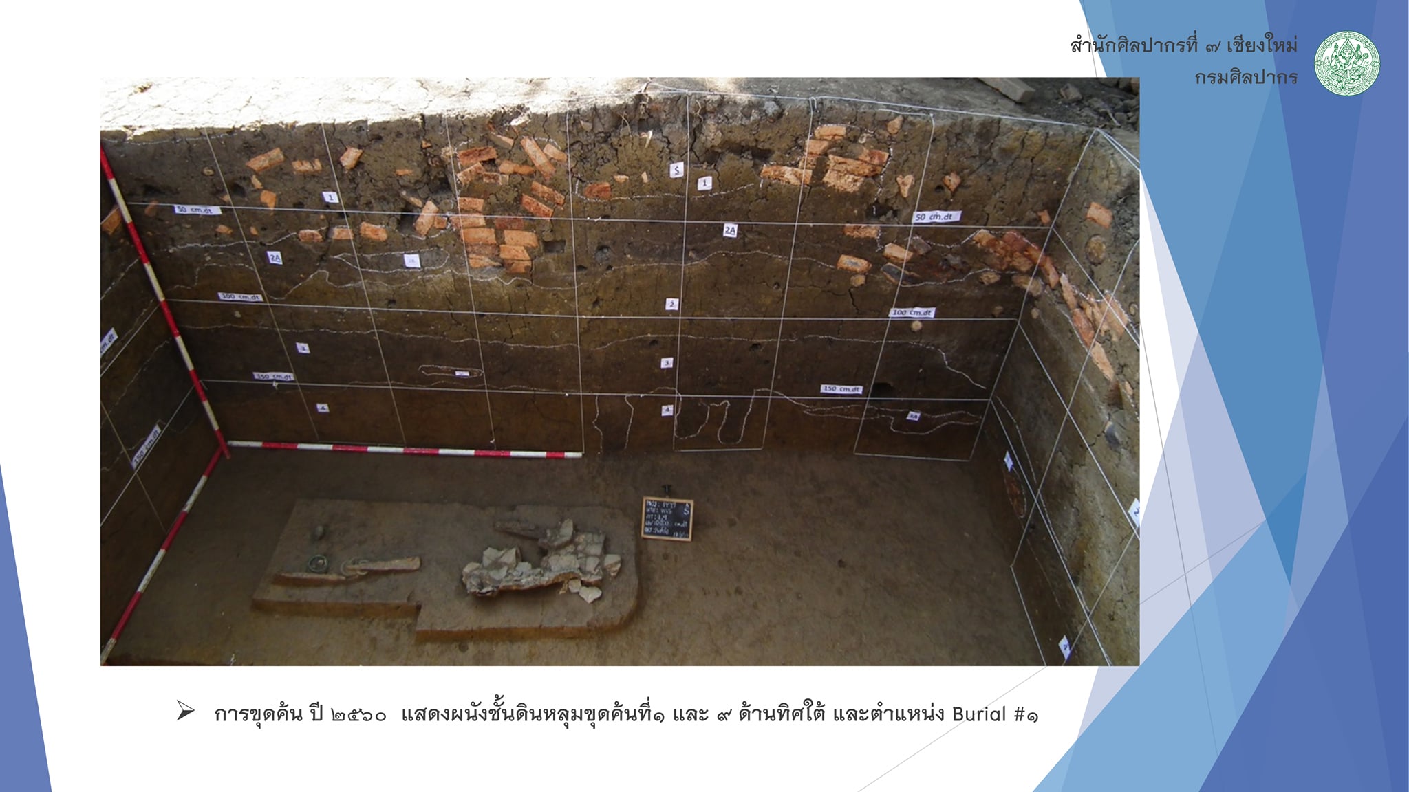 . เมื่อการขุดตรวจลึกกว่าพื้นระดับใช้งานสุดท้ายของกำแพงเมือง ได้พบหลักฐานแหล่งฝังศพของมนุษย์ในสมัยก่อนประวัติศาสตร์ในวัฒนธรรมยุคโลหะตอนปลายจากการขุดค้นบริเวณใต้แนวกำแพงเมือง จากขุดค้น ในT.P.5 พบโครงกระดูก 3 โครง มีการฝังศพแบบนอนหงาย เหยียดยาว ต่อมาเมื่อการดำเนินงานจนแล้วเสร็จ ได้พบโครงที่ 4 พบส่วนกะโหลกศีรษะ แต่ไม่ได้ขยายออกไปเพิ่มเติมเนื่องจากปัญหางบประมาณสรุปได้พบว่า เป็นชุมชนขนาดใหญ่ วัฒนธรรมของผู้ตาย น่าจะมีความเชื่อการฝังศพหัวหน้าไปทางทิศตะวันออก นอกจากนั้นในการขุดค้นและขุดแต่งยังพบ สิ่งของเครื่องใช้ฝังร่วมกับร่างผู้ตาย และมีความแตกต่างปริมาณและความหลากหลายในโครงที่ 1และ 2 กับโครงที่ 3 อาจแสดงให้เห็นความแตกต่างทางสถานะสังคมหรือเศรษฐกิจก็เป็นได้