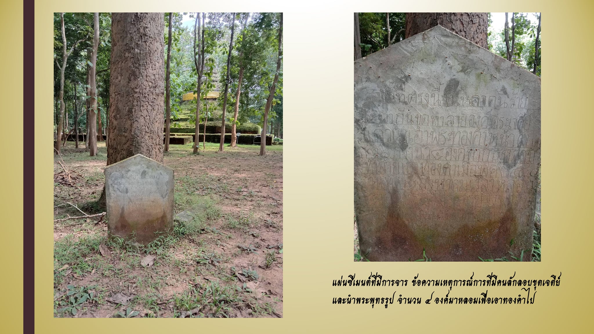 . ถ้าท่านมีโอกาสไปเยี่ยมชม วัดบุนนาค ใต้ต้นไม้ใหญ่(มะม่วง?) อยู่ทางด้านทิศตะวันตกเฉียงเหนือประมาณ ๓๐ เมตร ของเจดีย์ประธาน ที่โคนต้นพบแผ่นปูนซีเมนต์ มีการจารข้อความ ว่า “สถานที่ตรงนี้เหล่าคนร้ายได้พากันขุดองค์พระเจดีย์และนำพระทองคำหน้าตัก ๒๐ กว่านิ้ว ๔ องค์ ทำการหลอมเพื่อเอาทองคำเมื่อ พ.ศ. ๒๔๘๐ วันที่ ๒๑ สิงหาคม เวลาหลอมตอนแรกไม่ละลายจึงพากันตั้งศาลเพียงตา อธิษฐานขอเกิดเป็นคนชาติเดียว...(อักษรเลือน)” เมื่อไปตรวจสอบเอกสารพบว่า ตรงกันกับเหตุการณ์การลักลอบขุดที่วัดบุนนาค มีเพียงครั้งเดียว สิงหาคม ๒๔๖๐ ตามบันทึกว่า “วันพฤหัสบดี ขึ้น ๑๓ ค่ำ เดือน ๑๒ จุลศักราช ๑๒๗๙ พุทธศักราช ๒๔๖๐ ตรงกับ รศ.๑๓๖ เวลาเช้า ๓ โมงเช้า(๐๙.๐๐ น.)” จึงอาจจะเป็นความสับสนวัน ปี ของผู้จาร แต่จากข้อความ ทำให้ว่าได้ทราบสูญเสียพระพุทธรูปที่มีขนาดใกล้เคียงกับหลวงพ่อนาค ไปให้กับความโลภของมนุษย์ ถึง ๔ องค์ สันนิษฐานว่าคงจะมีพุทธศิลป์ที่งามไม่ด้อยกว่าหลวงพ่อนาก ที่หลงเหลือให้อนุชนรุ่นหลังได้ชม