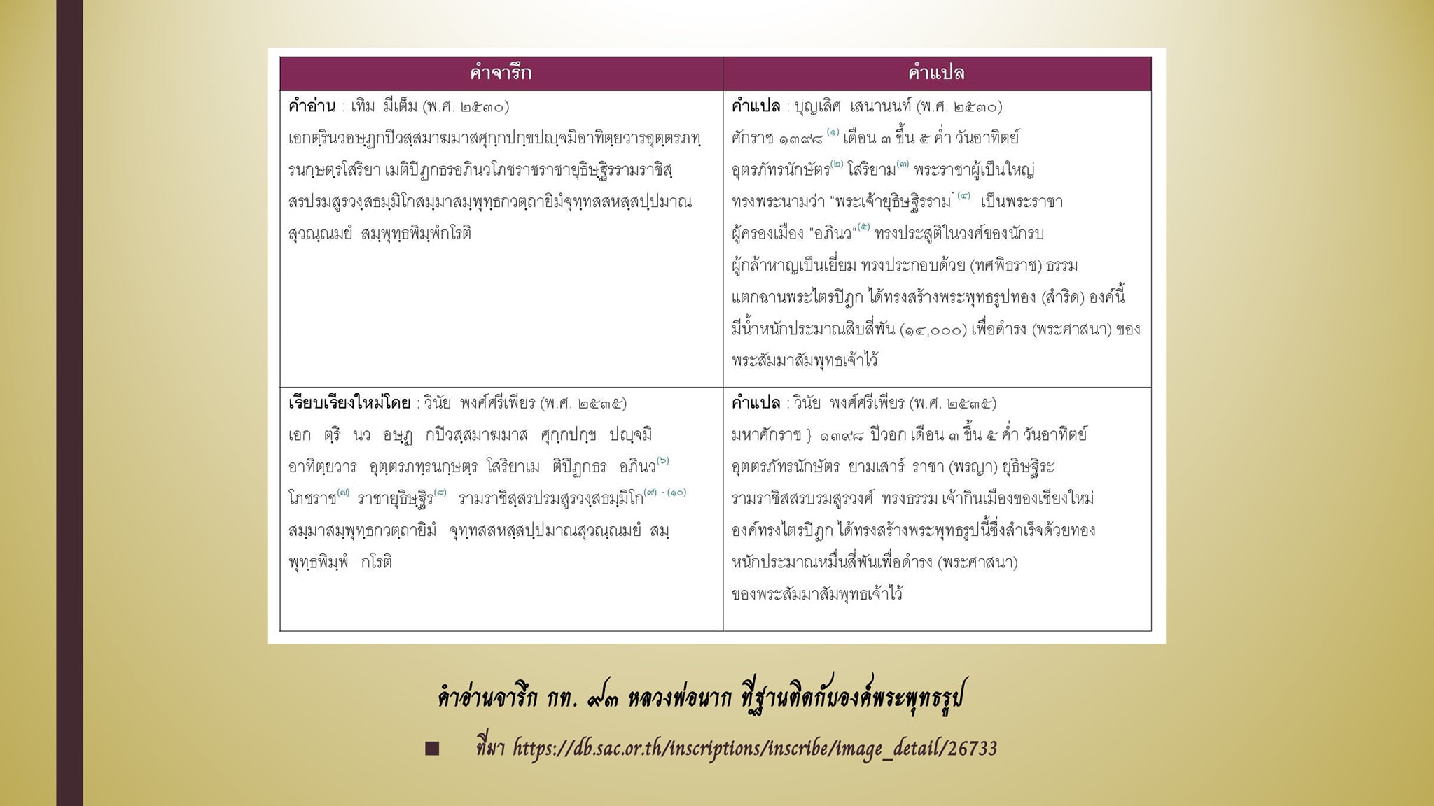 สุจิตต์ วงษ์ เทศ บรรณาธิการ.(๒๕๓๘). ประชุมจารึกเมืองพะเยา. กรุงเทพฯ: บริษัทพิฆเณศ พริ้นติ้งเซ็นเตอร์.