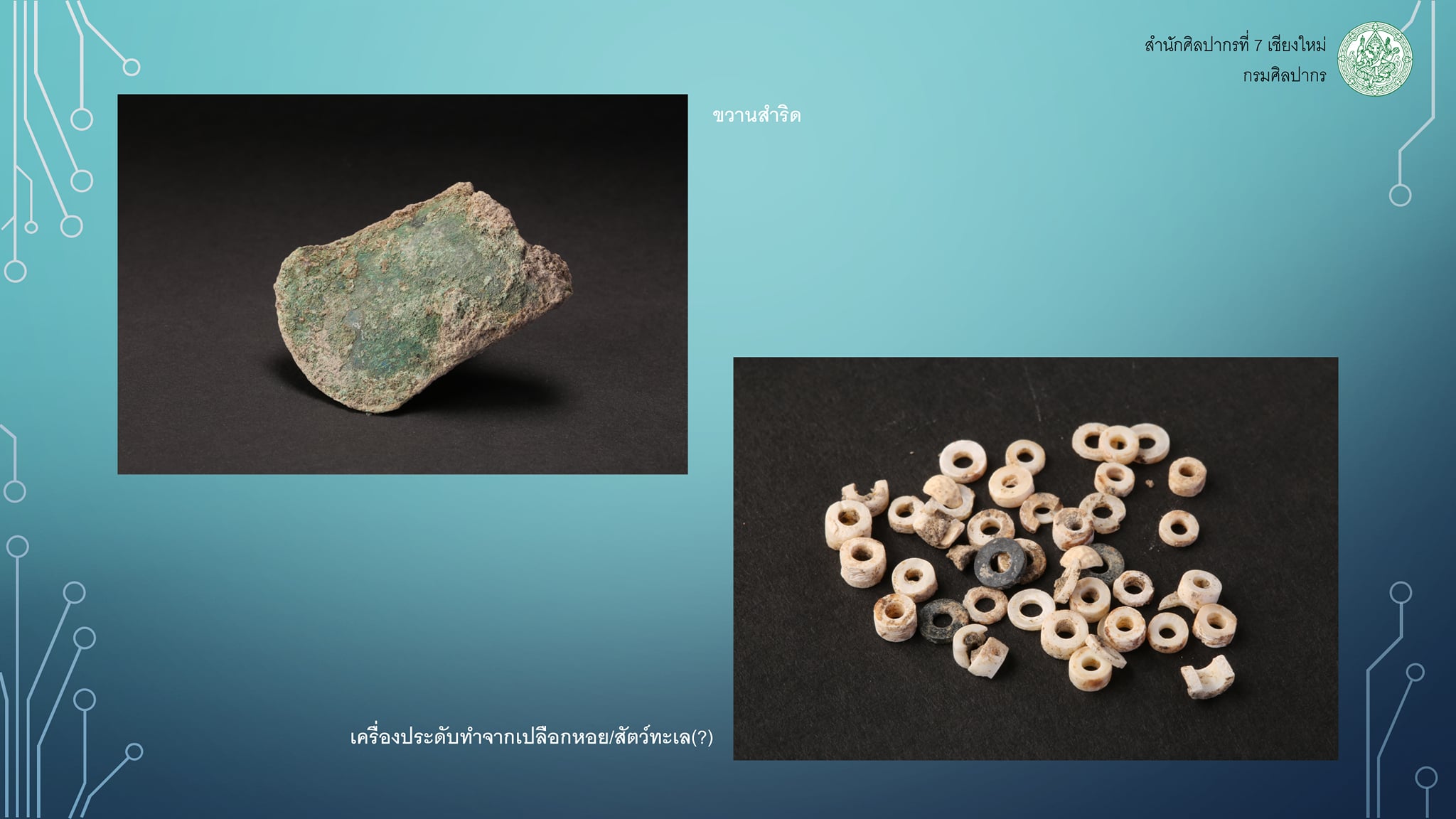 1. ชิ้นส่วนเครื่องประดับทำจากเปลือกหอย จากโครงกระดูกมนุษย์หมายเลข 2 ค่าอายุ 3,820-3,435 ปีมาแล้ว