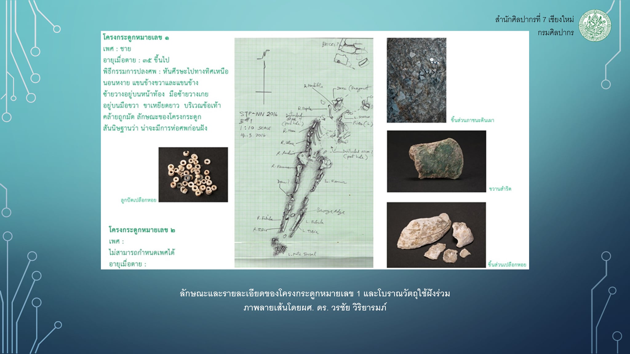 - โครงกระดูกมนุษย์หมายเลข 1 พบที่ระดับความลึกผิวดินประมาณ 10 เซนติเมตร ผลจากการวิเคราะห์โดยคุณประพิศ พงศ์มาศ นักโบราณคดีผู้เชี่ยวชาญทางด้านมานุษยวิทยากายภาพ ระบุว่า โครงกระดูกไม่สมบูรณ์ แตกหัก แต่ยังคงวางอยู่ในสภาพเดิมของร่างกาย เป็นเพศชายพิจารณาจาก Greater Sciatic notch ที่มีลักษณะเป็นรูปตัว V เป็นมุมแหลม เล็กแคบ อายุเมื่อตาย มากกว่า 35 ปี มีพิธีกรรมการปลงศพ โดยโครงกระดูกหันศีรษะไปทางทิศเหนือ นอนหงาย แขนขวาวางอยู่บนหน้าท้อง แขนซ้ายวางเฉียงอยู่บนหน้าท้อง มือวางเกยอยู่บนมือขวา ขาเหยียดยาว บริเวณข้อเท้าคล้ายถูกมัด ลักษณะทั่วไปของโครงกระดูกสันนิษฐานว่า น่าจะมีการห่อและมัดศพก่อนนำมาฝัง โบราณวัตถุที่พบ ได้แก่กลุ่มภาชนะดินเผาลายเชือกทาบ วางอยู่ด้านล่างไหล่ด้านซ้าย และสะโพกด้านซ้าย, ลูกปัดเปลือกหอยทรงกระบอก ø 3-4 มิลลิเมตร หนา 1-3 มิลลิเมตร พบบริเวณข้อมือทั้งสองข้างและกระดูกสะโพก, ขวานสำริดมีบ้องสภาพชำรุด วางอยู่บริเวณระหว่างกลางของกระดูกหน้าแข้ง และชิ้นส่วนเปลือกหอยทะเล? วางอยู่บริเวณปลายเท้า