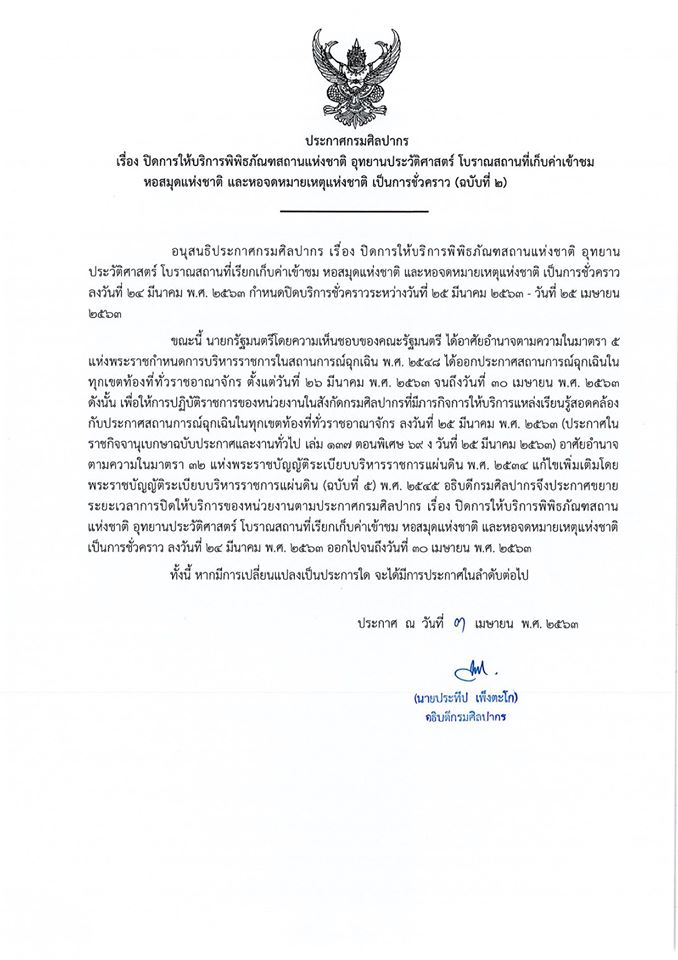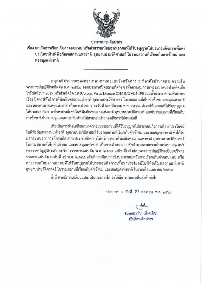 กรมศิลปากรขยายเวลาปิดบริการแหล่งเรียนรู้ในสังกัด พร้อมยกเว้นการเรียกเก็บค่าตอบแทนหรือค่าธรรมเนียมจากเอกชน งวดเดือนเมษายน ๒๕๖๓