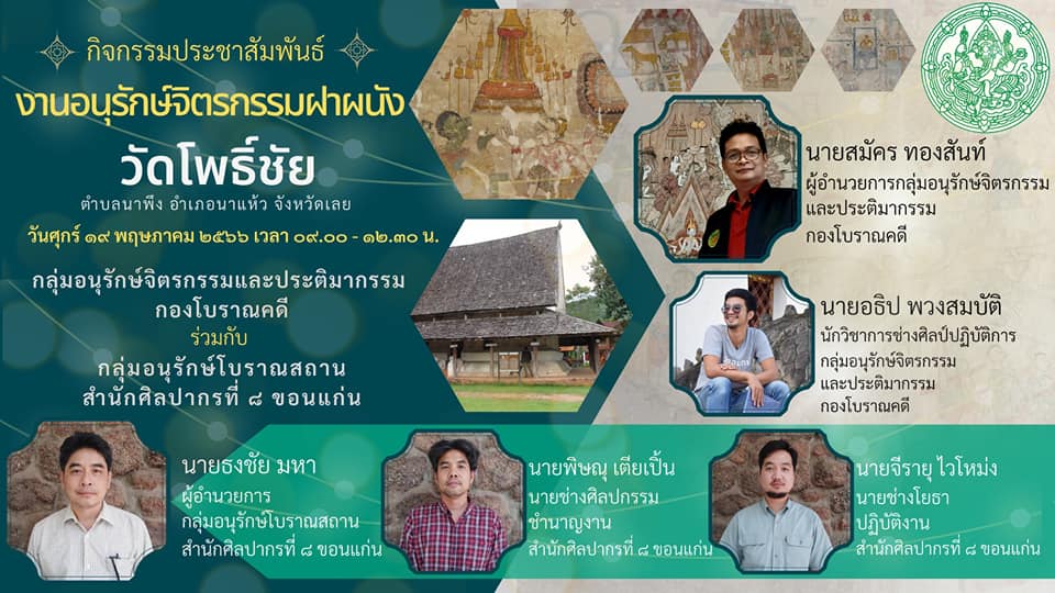 วันศุกร์ที่ ๑๙ พฤษภาคม ๒๕๖๖ กลุ่มอนุรักษ์จิตรกรรมและประติมากรรม กองโบราณคดี ร่วมกับกลุ่มอนุรักษ์โบราณสถาน สำนักศิลปากรที่ ๘ ขอนแก่น จัดกิจกรรมประชาสัมพันธ์ งานอนุรักษ์จิตรกรรมฝาผนังวิหาร (ฮักษ์ฮูปแต้ม นาแห้ว) เพื่อสร้างความรู้และความเข้าใจในหลักการอนุรักษ์ฯ ที่ถูกต้องร่วมกัน ให้กับวัด ผู้นำชุมชน และชาวชุมชนนาพึง ณ วัดโพธิ์ชัยนาพึง บ้านนาพึง ตำบลนาพึง อำเภอนาแห้ว จังหวัดเลย