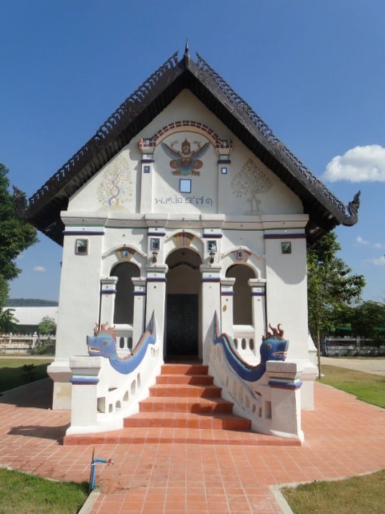 . อุโบสถ (สิม) ตัวอาคารมีแผนผังเป็นรูปสี่เหลี่ยมผืนผ้า หันหน้าไปทางทิศตะวันตก ขนาดกว้าง ๖ เมตร ยาว ๑๔ เมตร มีบันไดทางขึ้นด้านหน้าผายออก ราวบันไดทำเป็นพญานาคศิลปกรรมแบบอีสานพื้นถิ่น ตัวอาคารก่ออิฐถือปูนขนาด ๓ ห้อง มีมุขโถงด้านหน้าและราวโดยรอบมุขโถงทำเป็นเสาหลอกประดับวงโค้ง เหนือวงโค้งประดับกระจกเป็นลายริ้วสีเหลือง แดง เขียว และกระจกเงาทรงกลมในกรอบขนาดเล็ก ส่วนหน้าบันด้านหน้าเขียนสีรูปพญาครุฑในกรอบวงโค้งประดับเสาหลอก สองฝากข้างเขียนลายต้นไม้ บานประตูอุโบสถเป็นไม้แกะสลักนูนต่ำลายพันธุ์พฤกษา เหนือประตูเป็นซุ้มโค้งเขียนลายเส้นรูปดอกบัวและดอกไม้ประดับกระจกเงาเป็นวงกลมขนาดเล็ก ผนังด้านข้างมีหน้าต่างด้านละ ๑ ช่อง ฝ้าเพดานทำด้วยไม้ หลังคาเป็นเครื่องไม้ซ้อนกัน ๓ ชั้น มุงด้วยไม้แป้นเกล็ด ครอบหลังคาทำด้วยไม้แกะสลักไว้กึ่งกลางสันหลังคา โหง่ว (ช่อฟ้า) เป็นรูปหัวหงส์ ใบระกา และหางหงส์ทำเป็นรูปนาค แผงปิดคอสองแกะสลักเป็นรูปพญานาค รูปบุคคล รูปดอกไม้ กลางดอกไม้ประดับกระจกเงาวงกลมและทาสี เชิงชายแกะสลักเป็นรูปนาคเกี้ยวและทาสี ภายในอุโบสถมีพระประธานปูนปั้นฝีมือช่างท้องถิ่น