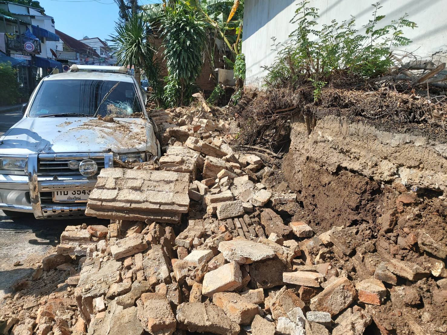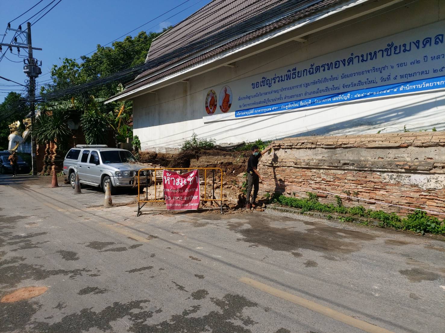 นายประทีป เพ็งตะโก อธิบดีกรมศิลปากร เปิดเผยว่า สำนักศิลปากรที่ ๗ เชียงใหม่ ได้ลงพื้นที่ตรวจสอบความเสียหายของกำแพงวัดยางกวง จังหวัดเชียงใหม่ ซึ่งพังถล่มลงมาหลังจากเกิดพายุฝนฟ้าคะนองและลมกระโชกแรงในพื้นที่อำเภอเมืองเชียงใหม่ เมื่อคืนวันที่ ๒ พฤษภาคมที่ผ่านมา พบว่า กำแพงวัดด้านทิศตะวันออกซึ่งเป็นกำแพงก่ออิฐเดิมสูงประมาณ ๑.๕๐ เมตร หนา ๐.๔๐ เมตร มีอายุการสร้างประมาณ ๘๐ – ๑๐๐ ปี อยู่ในเขตประกาศขึ้นทะเบียนโบราณสถานวัดยางกวง ได้พังเสียหายลงมาเป็นระยะทางยาวประมาณ ๑๕ เมตร จากการตรวจสอบและวิเคราะห์ความเสียหายเบื้องต้นพบว่า บริเวณด้านในของกำแพงที่พังเสียหาย มีการก่อสร้างศาลาบาตรและลานประทักษิณรอบ ๆ องค์เจดีย์วัดยางกวง (ก่อสร้างมาประมาณสิบปีแล้ว) มีการถมดินปนเศษอิฐหักรองพื้น และยกพื้นสูงกว่าพื้นถนนด้านนอก เมื่อมีปริมาณน้ำฝนที่มากทำให้น้ำฝนซึมลงสู่ชั้นดินด้านล่าง ด้วยความสูงของการถมดินพื้นด้านในกำแพงมากกว่า ๑.๕๐ เมตร โดยอาศัยกำแพงก่ออิฐเดิมเป็นผนังที่รับแรงดันด้านข้าง ประกอบกับอายุการก่อสร้างกำแพง ซึ่งชำรุดทรุดโทรมตามกาลเวลาอยู่แล้ว กำแพงก่ออิฐจึงไม่สามารถรับแรงดันดินด้านข้างจากภายในนี้ได้ทำให้เกิดเหตุดังกล่าว