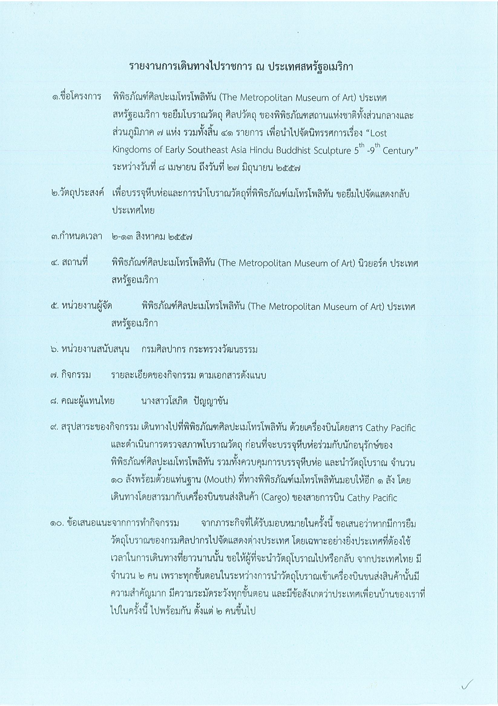 รายงานการเดินทางไปราชการ ณ สหรัฐอเมริกา ระหว่างวันที่ 2 – 13 สิงหาคม 2557 โครงการบรรจุหีบห่อและนำโบราณวัตถุที่พิพิธภัณฑ์เมโทรโพลิทันขอยืมไปจัดแสดงกลับประเทศไทย