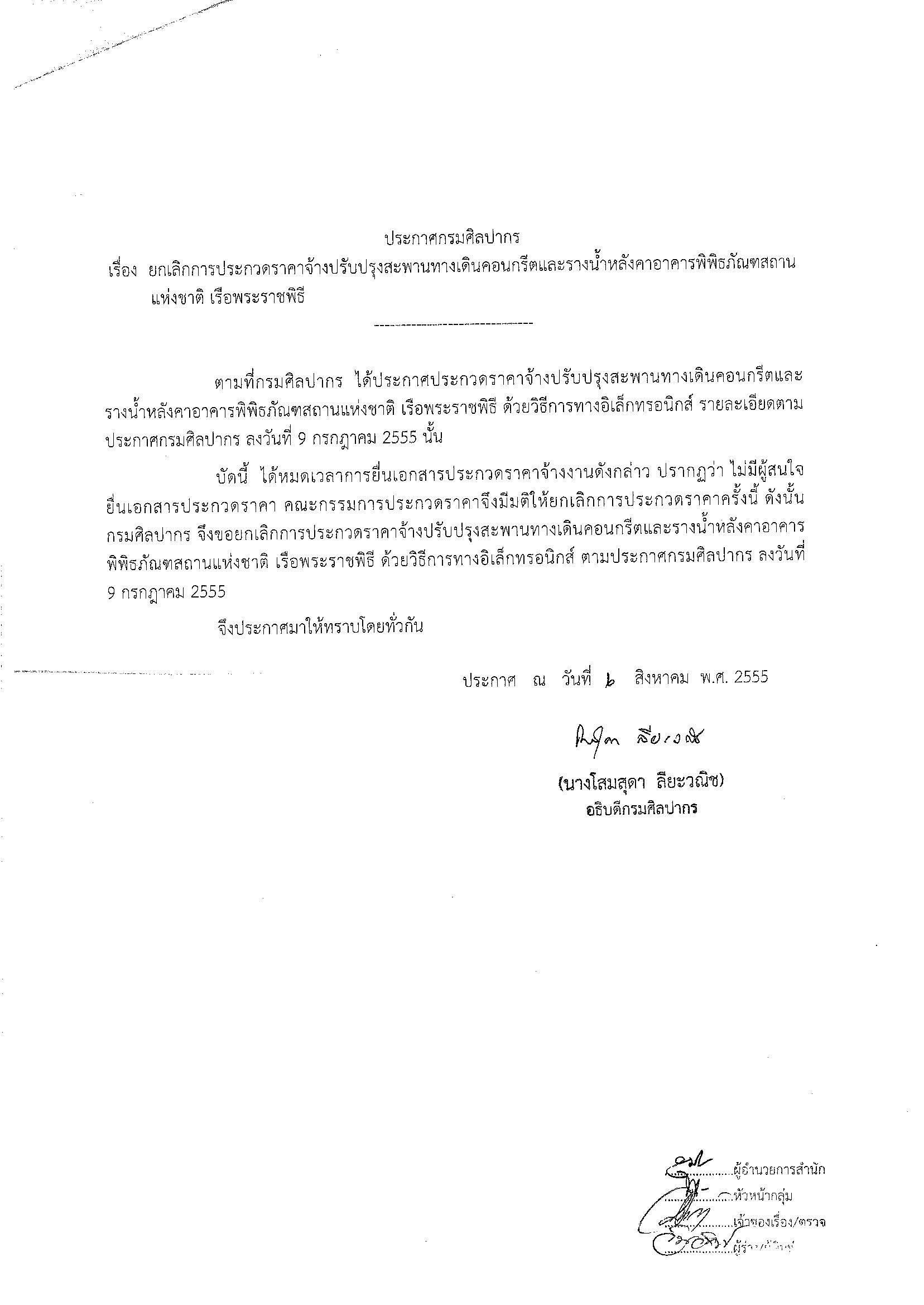 ยกเลิกประกวดราคาจ้างปรับปรุงสะพานทางเดินคอนกรีตและรางน้ำหลังคาอาคารพิพิธภัณฑสถานแห่งชาติ เรือพระราชพิธี