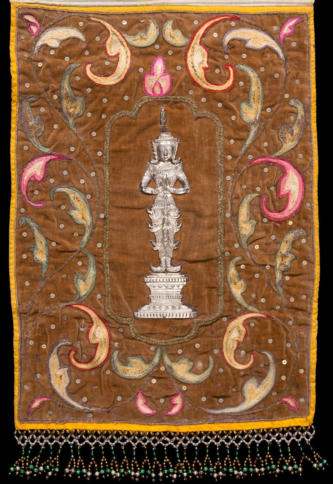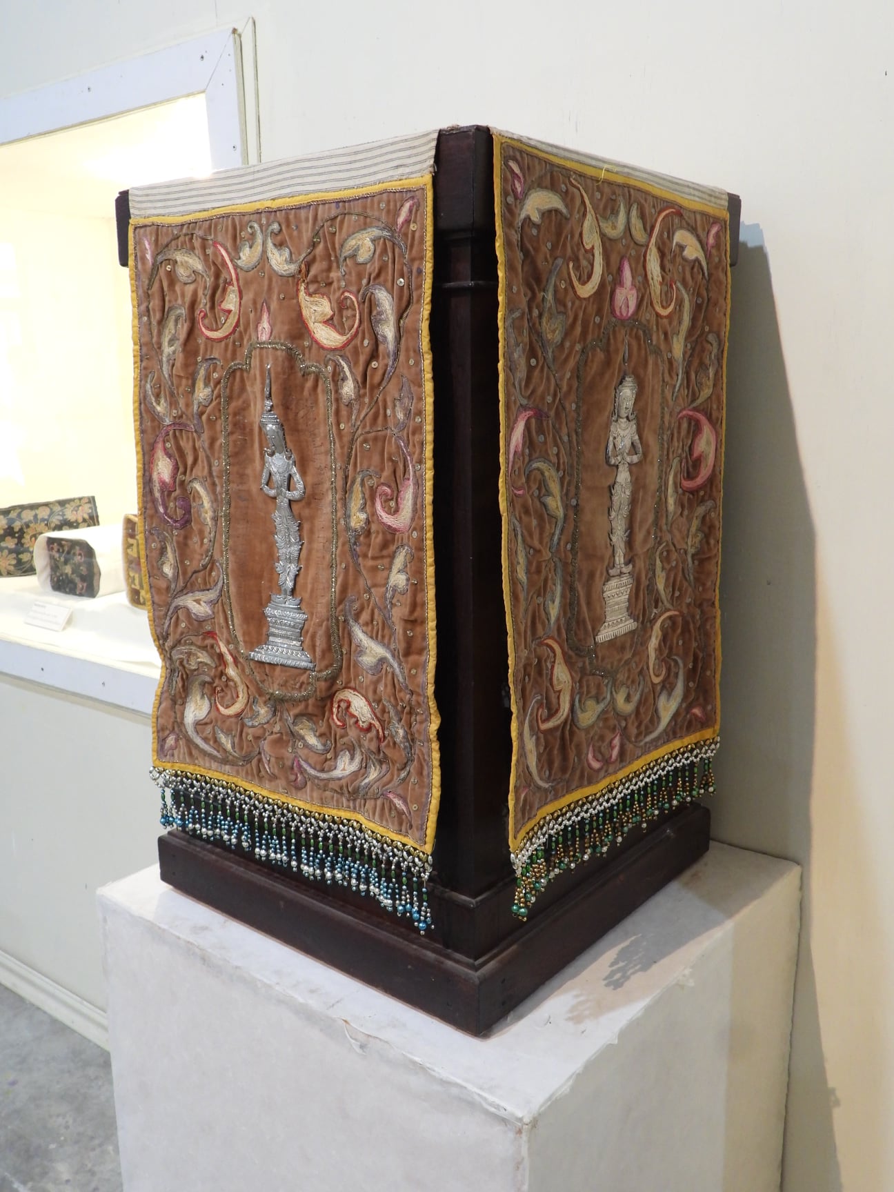 ผืนผ้าแพร ปักประดับด้วยรูปเทพพนมดุนจากเงิน โดยรอบปักเป็นรูปดอกไม้ใบไม้ด้วยไหมสีต่างๆ ชายผ้าด้านล่างเป็นลูกปัดร้อยเป็นแถบ ใช้สำหรับวางบนกากะเยีย ส่วนมากมักทำเป็น ๓ ผืน หรือ ๔ ผืน ตามลักษณะของแท่นวางที่เป็นไม้นำมามัดขัดกันสำหรับวางคัมภีร์พระธรรมในวาระต่างๆ เช่น งานตั้งธรรมหลวง อันหมายถึงพระเพณีเทศมหาชาติของภาคเหนือ นอกจากนี้ยังพบการทำผ้าชนิดนี้อุทิศถวายเนื่องในงานปลงศพอีกด้วย