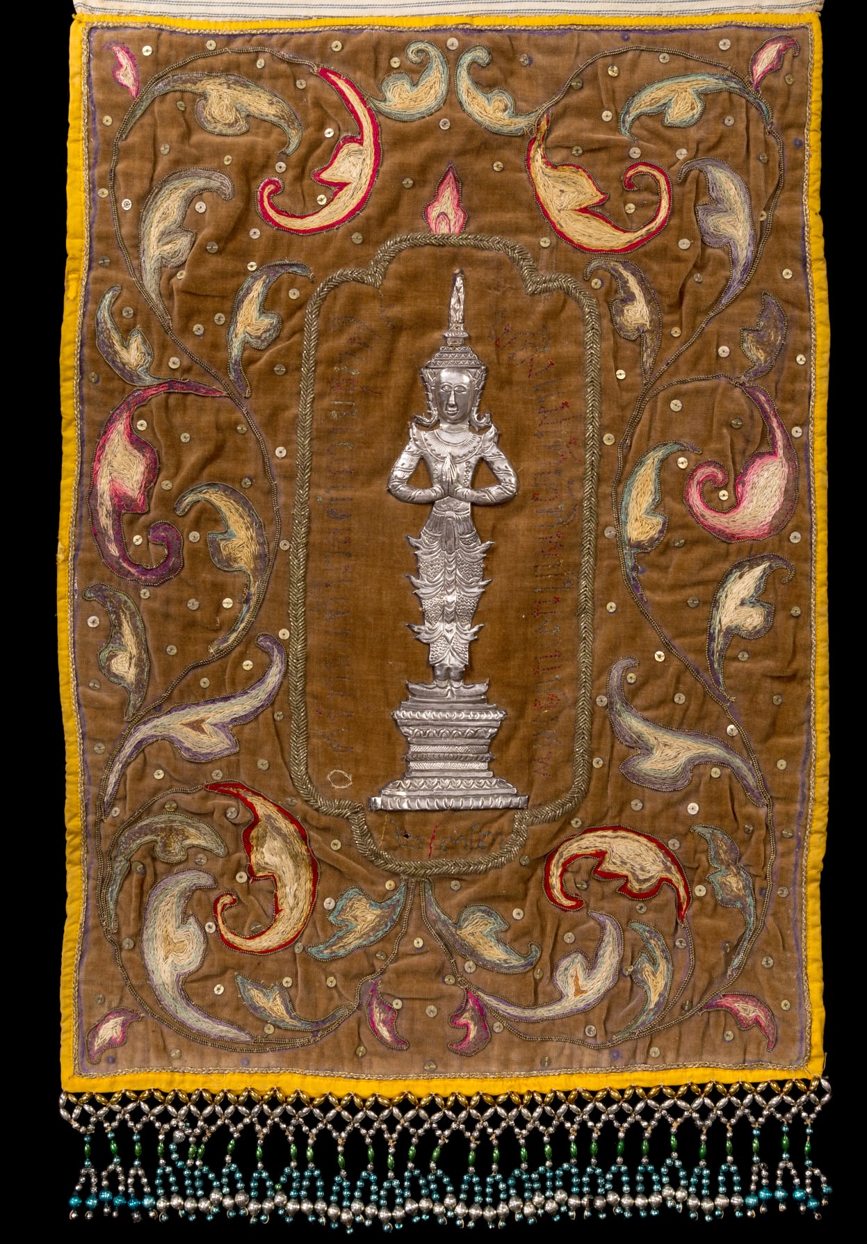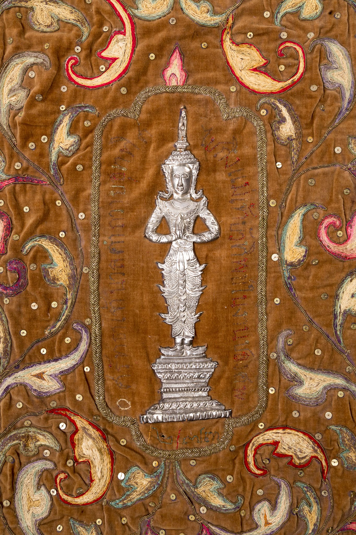 มีข้อความปักด้วยไหมสี ระบุว่า “ศรัทธาเจ้านวลคำถวายอุททิศ ไปถึงแม่เจ้าบัวทิพย์ในงานปลงศพ”