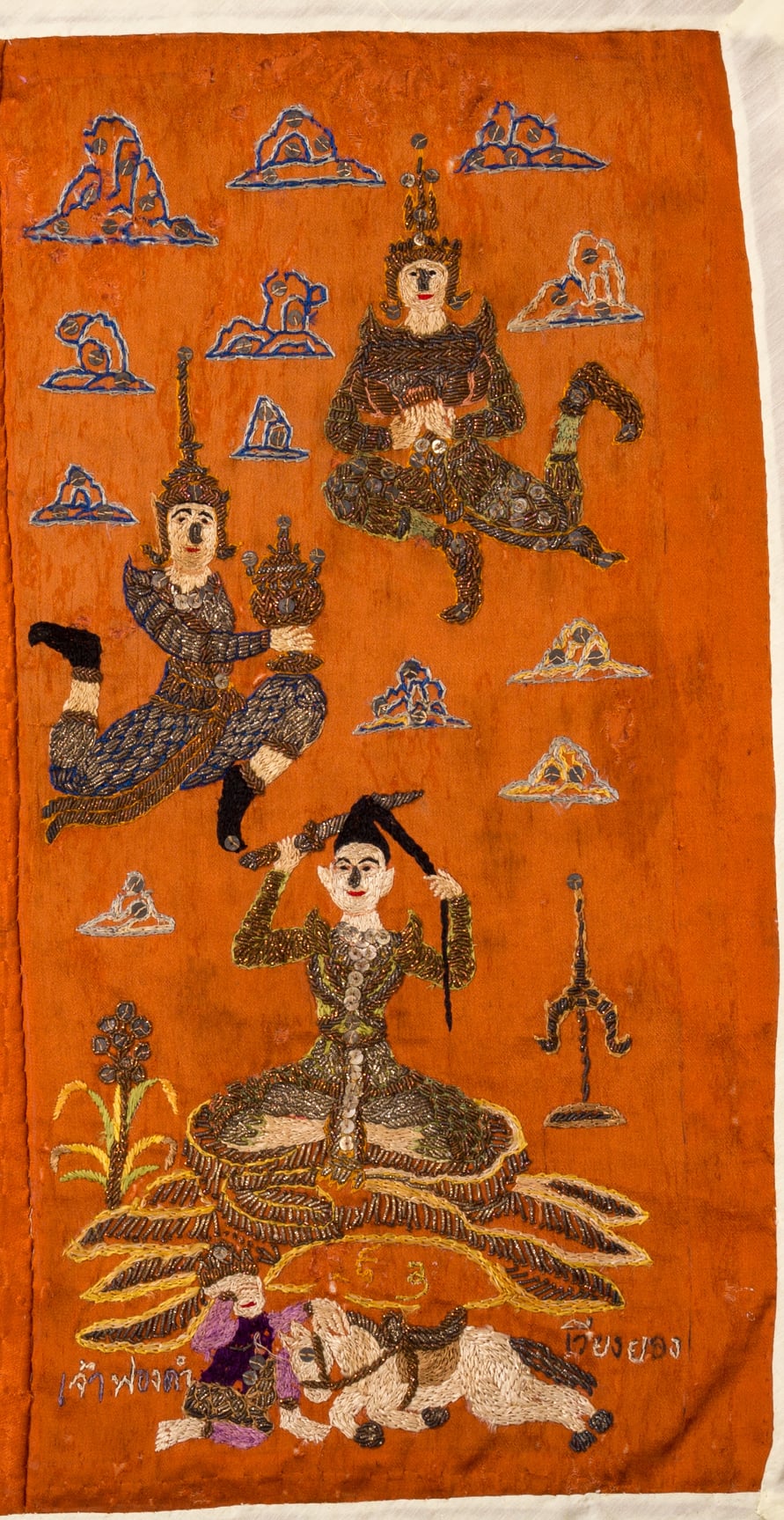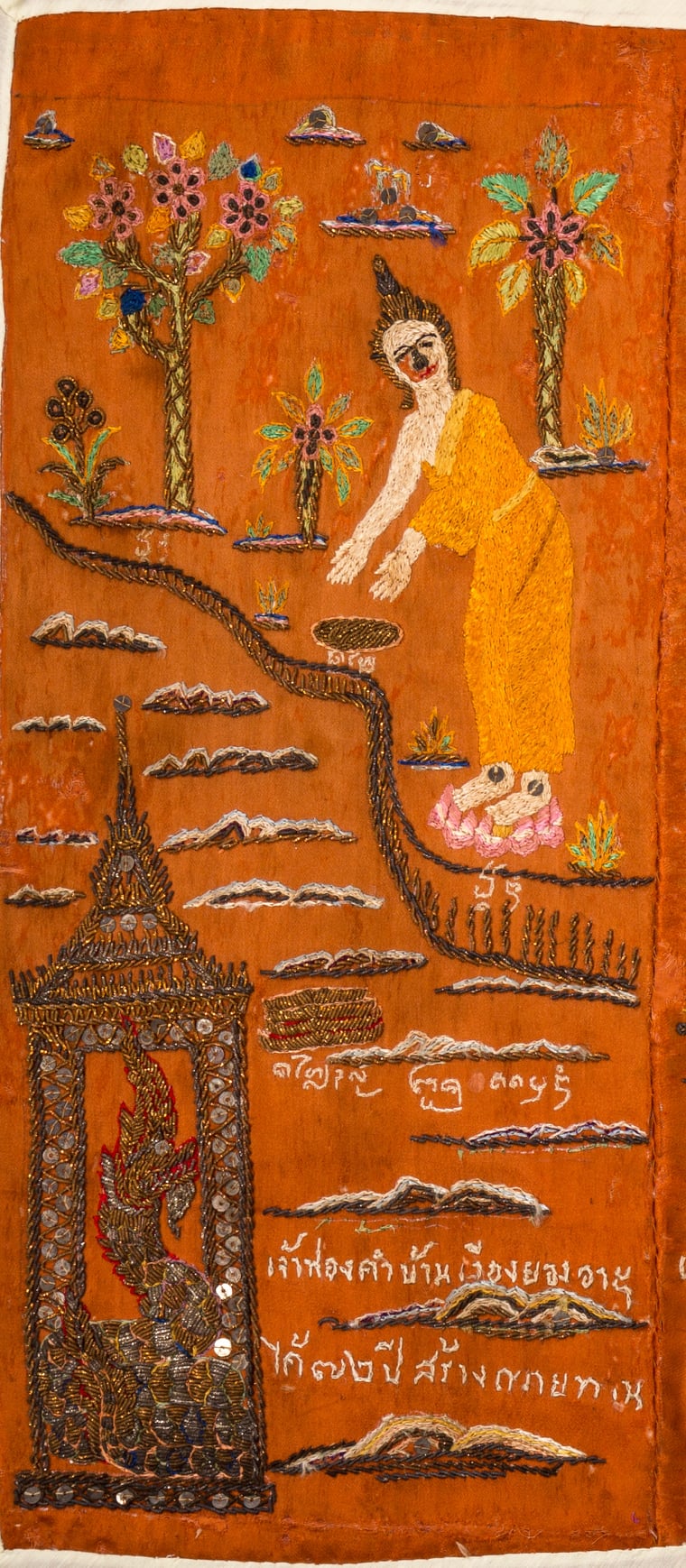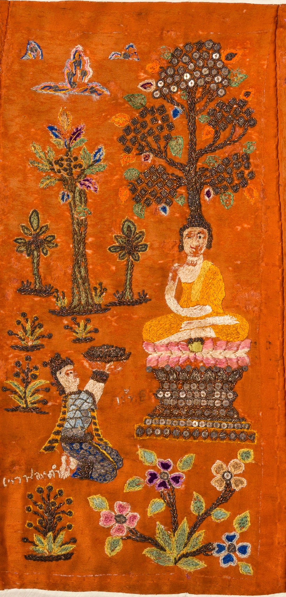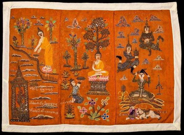 ผ้าปักเล่าเรื่องพุทธประวัติ ด้วยไหมสี ประดับด้วยดิ้นและเลื่อมโลหะ