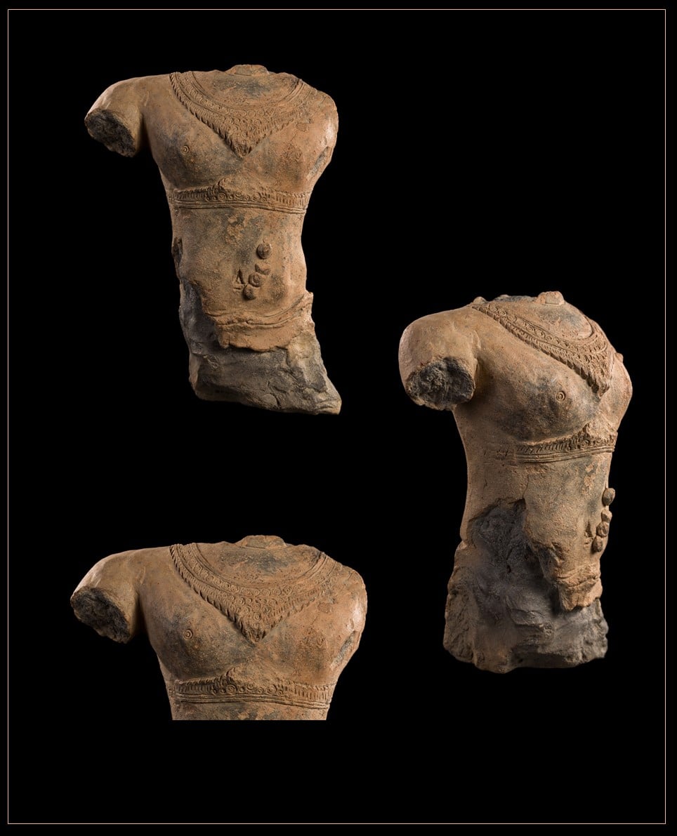 ประติมากรรมบุคคลชิ้นนี้เป็ประติมากรรมบุคคลเพศชาย สูง ๒๔ เซนติเมตร ในลักษณะเอียงตน คล้ายกบการยืนตริภังค์ในประติมากรรมที่ได้รับอิทธิพลจากศิลปะอินเดีย พบเพียงส่วนบนสวมเครื่องประดับที่คอเรียกว่ากรองศอ ที่ใต้อุระหรือหน้าอกมีเครื่องประดับเรียกว่าอุทรพันธะ สวมสังวาลเหลือร่องรอยของลุกปัดเพียง ๔ เม็ด เป็นประติมกรรมในลักษณะนูนต่ำสำหรับประดับอาคาร คล้ายกับพระพุทธรูปแสดงวิตรรกมุทราดินเผาในศิลปะหริภุญไชยที่มีลักษณะด้านหลังแบนเรียบ