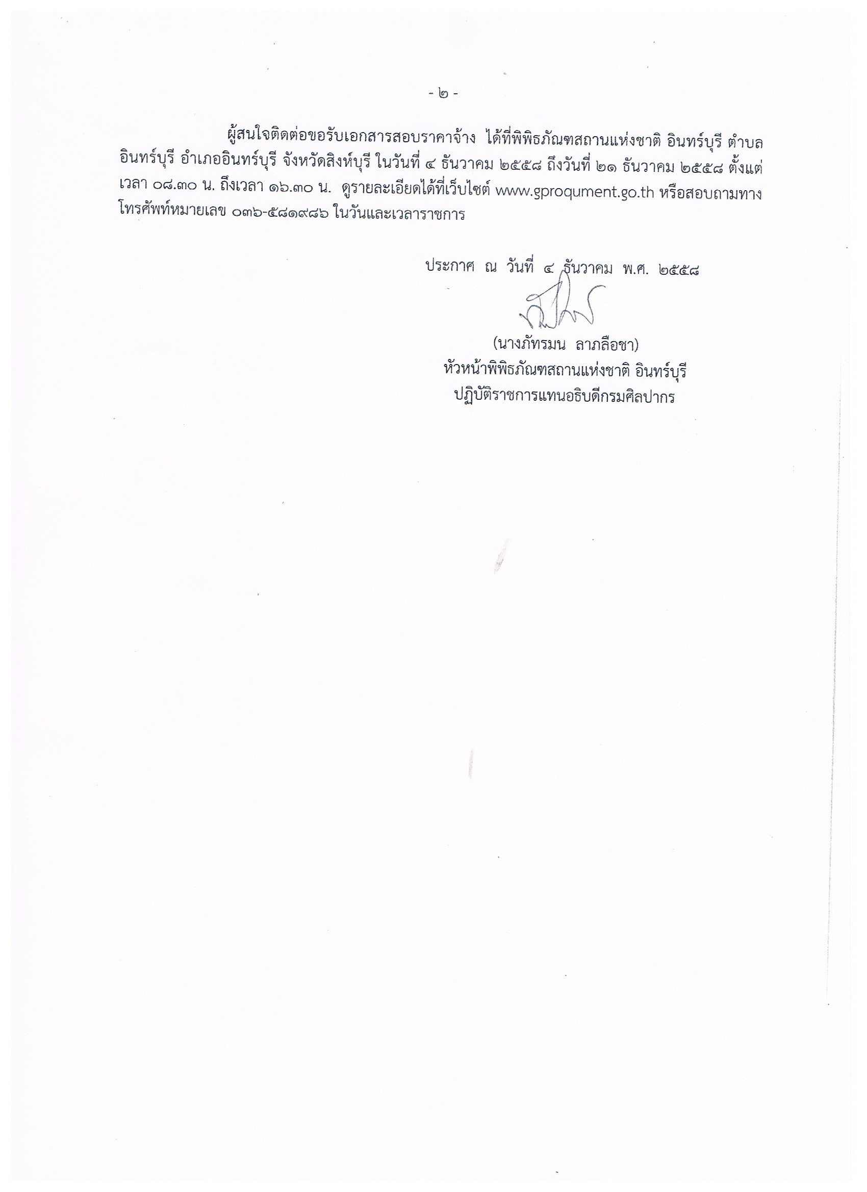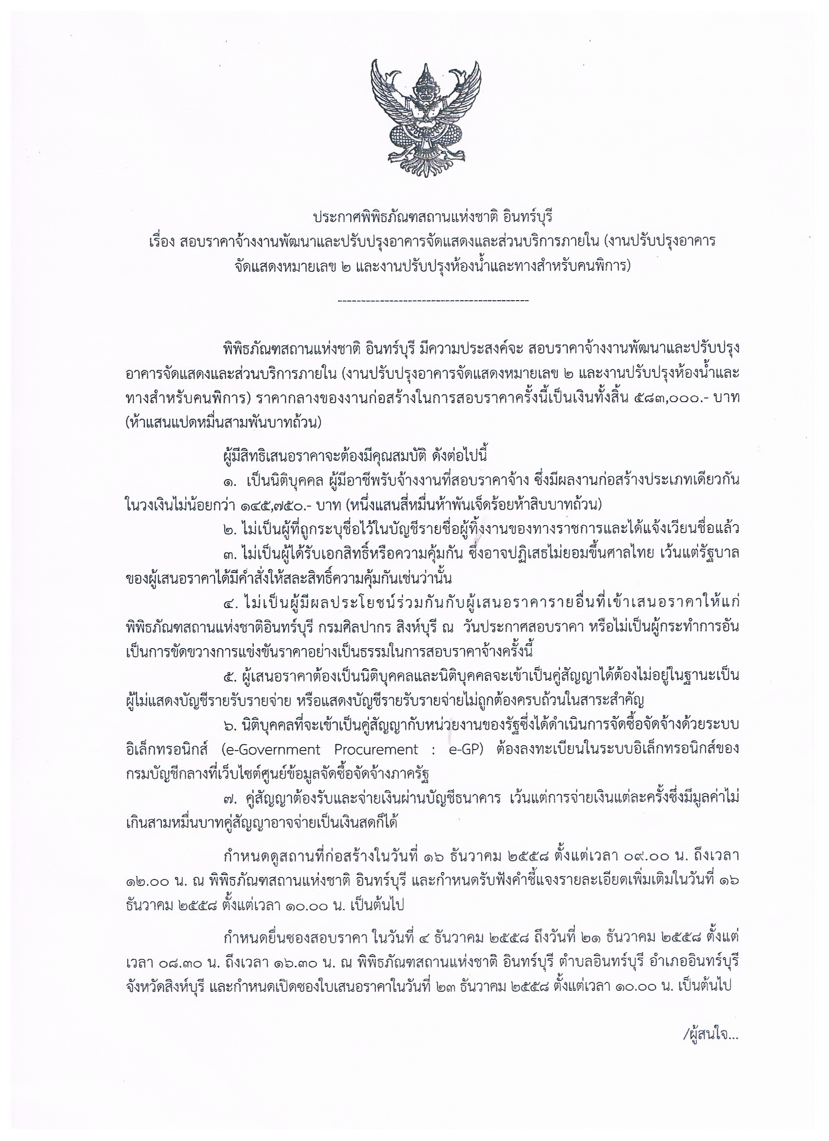 ประกาศพิพิธภัณฑสถานแห่งชาติ อินทร์บุรี เรื่อง เชิญชวนงานสอบราคาจ้างงานพัฒนาและปรับปรุงอาคารจัดแสดงและส่วนบริการภายใน (งานปรับปรุงอาคาร จัดแสดงหมายเลข ๒ และงานปรับปรุงห้องน้ำและทางสำหรับคนพิการ)
