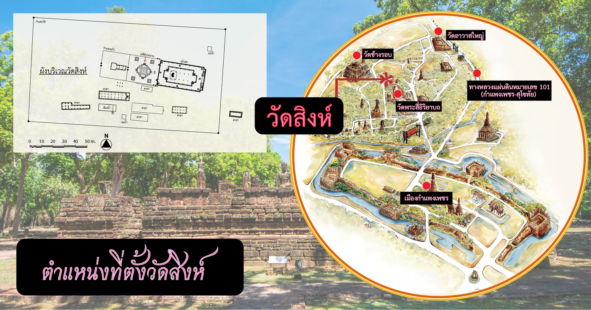วัดสิงห์เป็นโบราณสถานที่ตั้งอยู่ทางทิศตะวันตกเฉียงเหนือนอกเมืองกำแพงเพชร ภายในวัดพบหลักฐานการนำปูนมาใช้ประกอบงานสถาปัตยกรรมจากภาพถ่ายสมัยรัชกาลที่ 5 จากรายงานการดำเนินการขุดแต่งทางโบราณคดี และการสำรวจเก็บข้อมูลในปัจจุบัน