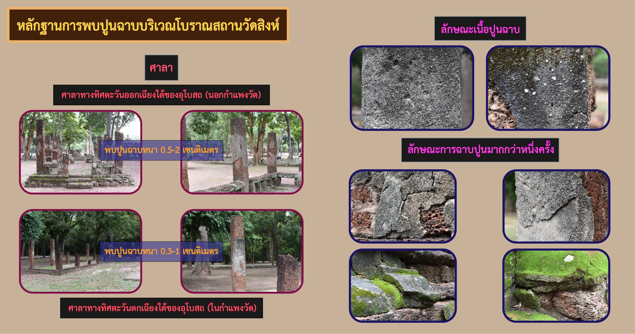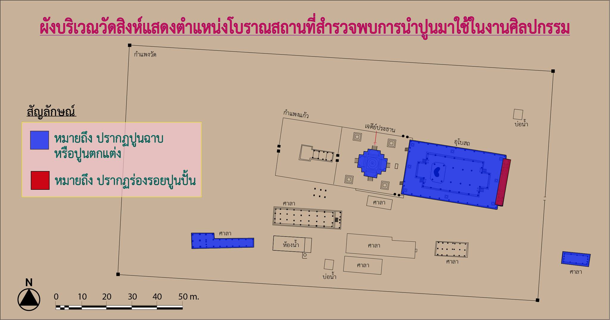 - อุโบสถ พบปูนฉาบบริเวณเสารองรับหลังคา และเสาบริเวณบันไดทางขึ้นอาคาร มีความหนาประมาณ 2 เซนติเมตร