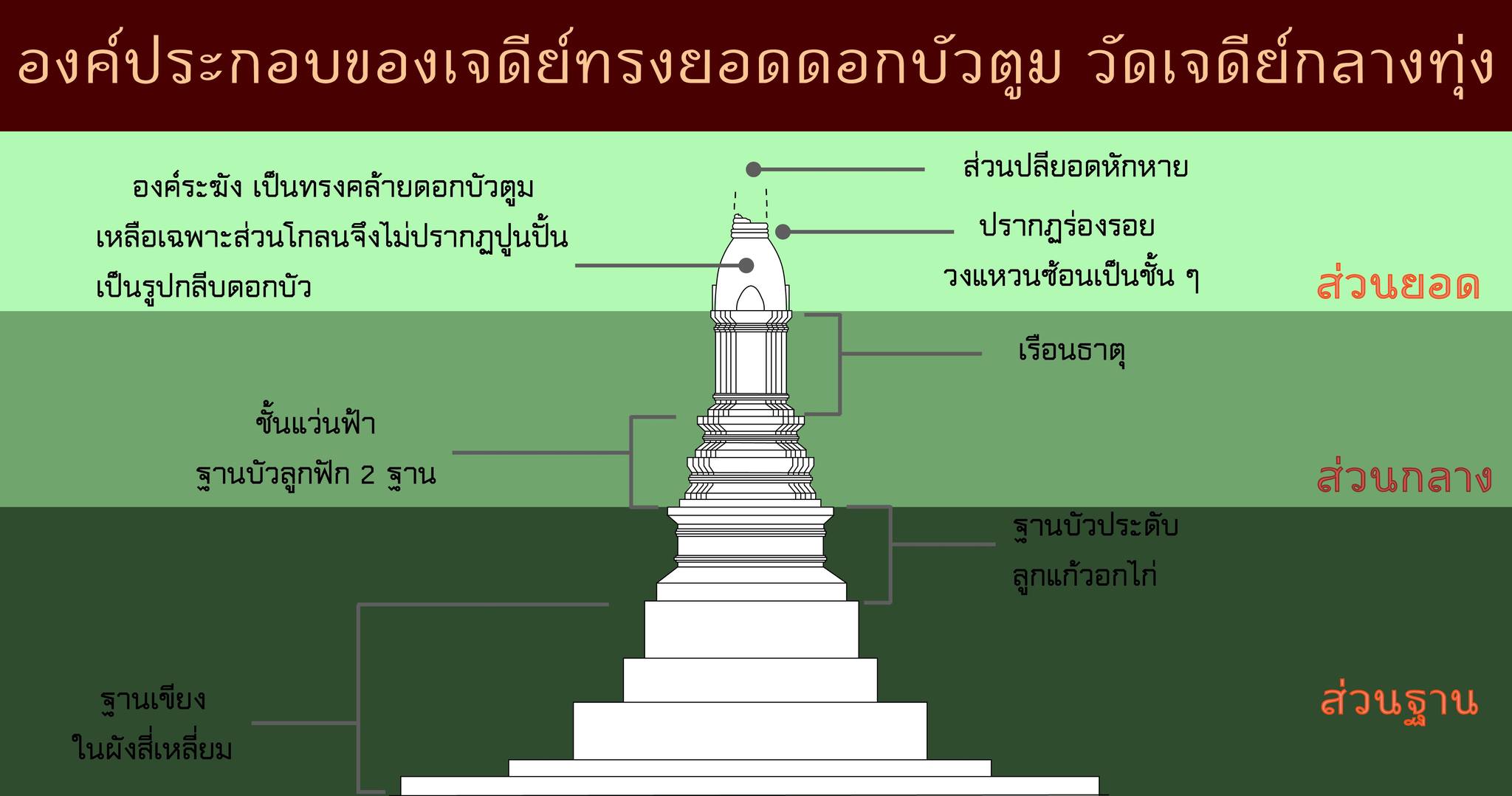 เจดีย์ทรงยอดดอกบัวตูมนี้ถือเป็นรูปแบบเฉพาะของสถาปัตยกรรมสุโขทัย เนื่องจากพบเจดีย์ทรงนี้อย่างแพร่หลายตามหัวเมืองต่าง ๆ หรือที่เกี่ยวข้องกับเมืองสุโขทัย มีรายละเอียดส่วนประกอบโดยรวม ดังนี้