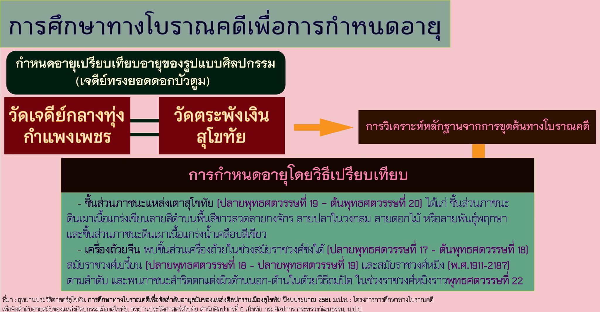 ปีงบประมาณ 2561. ม.ป.ท. : โครงการการศึกษาทางโบราณคดีเพื่อจัดลำดับอายุสมัยของแหล่งศิลปกรรมเมืองสุโขทัย, อุทยานประวัติศาสตร์สุโขทัย สำนักศิลปากรที่ 6 สุโขทัย กรมศิลปากร กระทรวงวัฒนธรรม, ม.ป.ป.