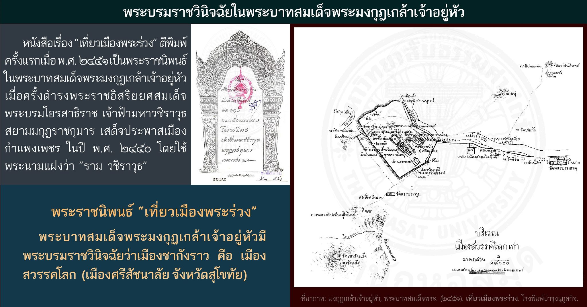หนังสือเรื่อง “เที่ยวเมืองพระร่วง” ตีพิมพ์ครั้งแรกเมื่อ พ.ศ. ๒๔๕๑ เป็นพระราชนิพนธ์ในพระบาทสมเด็จพระมงกุฎเกล้าเจ้าอยู่หัว เมื่อครั้งดำรงพระราชอิสริยยศสมเด็จพระบรมโอรสาธิราช เจ้าฟ้ามหาวชิราวุธ สยามมกุฎราชกุมาร เสด็จประพาสเมืองกำแพงเพชร ในปี พ.ศ. ๒๔๕๐ โดยใช้พระนามแฝงว่า “ราม วชิราวุธ”