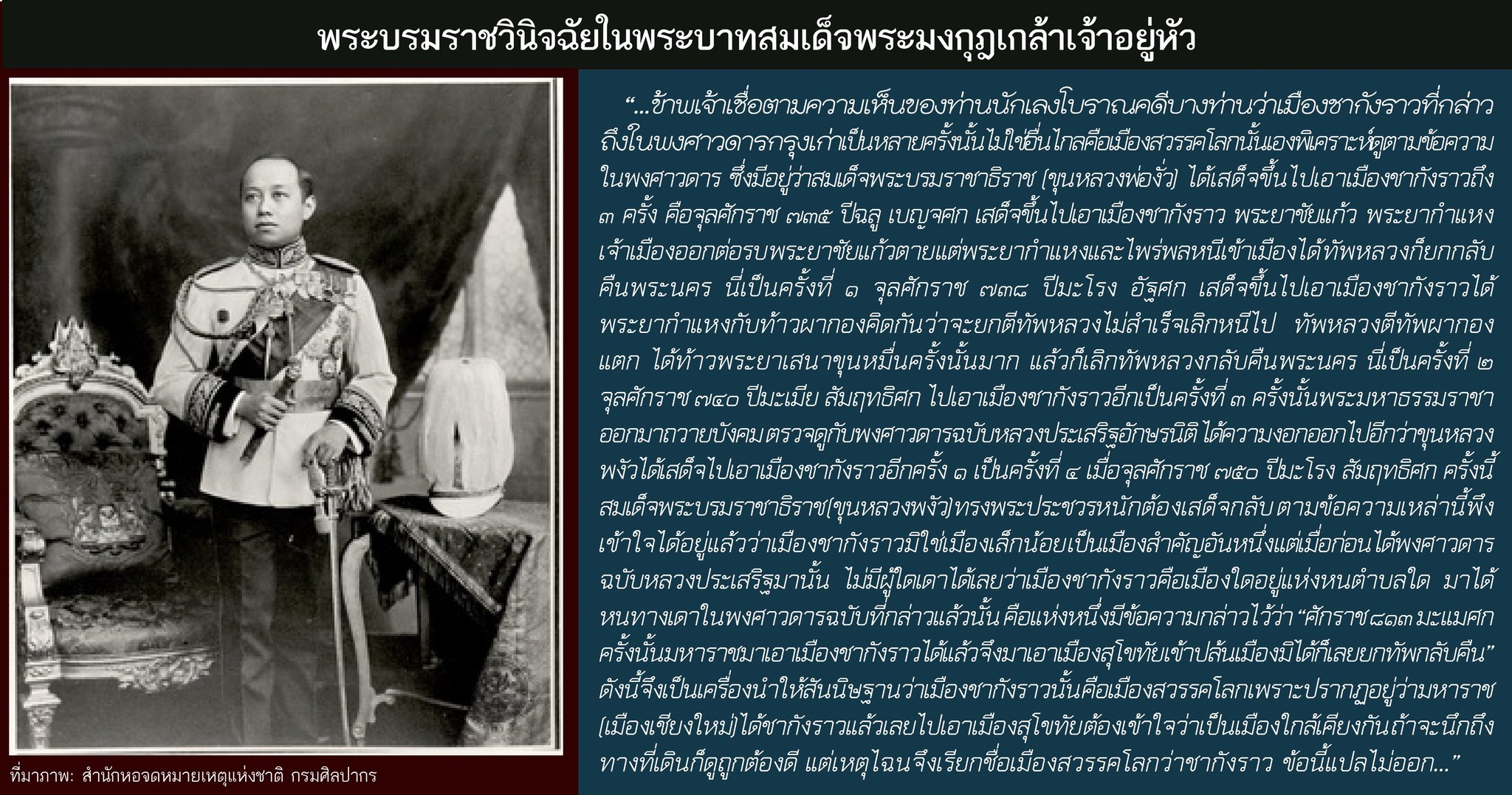 “...ข้าพเจ้าเชื่อตามความเห็นของท่านนักเลงโบราณคดีบางท่านว่าเมืองชากังราวที่กล่าวถึงในพงศาวดารกรุงเก่าเป็นหลายครั้งนั้นไม่ใช่อื่นไกล คือเมืองสวรรคโลกนั้นเอง พิเคราะห์ดูตามข้อความในพงศาวดาร ซึ่งมีอยู่ว่าสมเด็จพระบรมราชาธิราช (ขุนหลวงพ่องั่ว) ได้เสด็จขึ้นไปเอาเมืองชากังราวถึง ๓ ครั้ง คือจุลศักราช ๗๓๕ ปีฉลู เบญจศก เสด็จขึ้นไปเอาเมืองชากังราว พระยาชัยแก้ว พระยากำแหง เจ้าเมืองออกต่อรบ พระยาชัยแก้วตาย แต่พระยากำแหงและไพร่พลหนีเข้าเมืองได้ ทัพหลวงก็ยกกลับคืนพระนคร นี่เป็นครั้งที่ ๑ จุลศักราช ๗๓๘ ปีมะโรง อัฐศก เสด็จขึ้นไปเอาเมืองชากังราวได้ พระยากำแหงกับท้าวผากองคิดกันว่าจะยกตีทัพหลวงไม่สำเร็จเลิกหนีไป ทัพหลวงตีทัพผากองแตก ได้ท้าวพระยาเสนาขุนหมื่นครั้งนั้นมาก แล้วก็เลิกทัพหลวงกลับคืนพระนคร นี่เป็นครั้งที่ ๒ จุลศักราช ๗๔๐ ปีมะเมีย สัมฤทธิศก ไปเอาเมืองชากังราวอีกเป็นครั้งที่ ๓ ครั้งนั้นพระมหาธรรมราชาออกมาถวายบังคม ตรวจดูกับพงศาวดารฉบับหลวงประเสริฐอักษรนิติ ได้ความงอกออกไปอีกว่าขุนหลวงพงัวได้เสด็จไปเอาเมืองชากังราวอีกครั้ง ๑ เป็นครั้งที่ ๔ เมื่อจุลศักราช ๗๕๐ ปีมะโรง สัมฤทธิศก ครั้งนี้สมเด็จพระบรมราชาธิราช (ขุนหลวงพงัว) ทรงพระประชวรหนักต้องเสด็จกลับ ตามข้อความเหล่านี้พึงเข้าใจได้อยู่แล้วว่าเมืองชากังราวมิใช่เมืองเล็กน้อย เป็นเมืองสำคัญอันหนึ่ง แต่เมื่อก่อนได้พงศาวดารฉบับหลวงประเสริฐมานั้น ไม่มีผู้ใดเดาได้เลยว่าเมืองชากังราวคือเมืองใดอยู่แห่งหนตำบลใด มาได้หนทางเดาในพงศาวดารฉบับที่กล่าวแล้วนั้น คือแห่งหนึ่งมีข้อความกล่าวไว้ว่า “ศักราช ๘๑๓ มะแมศก ครั้งนั้นมหาราชมาเอาเมืองชากังราวได้แล้วจึงมาเอาเมืองสุโขทัย เข้าปล้นเมืองมิได้ก็เลยยกทัพกลับคืน” ดังนี้จึงเป็นเครื่องนำให้สันนิษฐานว่าเมืองชากังราวนั้น คือเมืองสวรรคโลก เพราะปรากฏอยู่ว่ามหาราช (เมืองเชียงใหม่) ได้ชากังราวแล้วเลยไปเอาเมืองสุโขทัย ต้องเข้าใจว่าเป็นเมืองใกล้เคียงกัน ถ้าจะนึกถึงทางที่เดินก็ดูถูกต้องดี แต่เหตุไฉนจึงเรียกชื่อเมืองสวรรคโลกว่าชากังราว ข้อนี้แปลไม่ออก...”