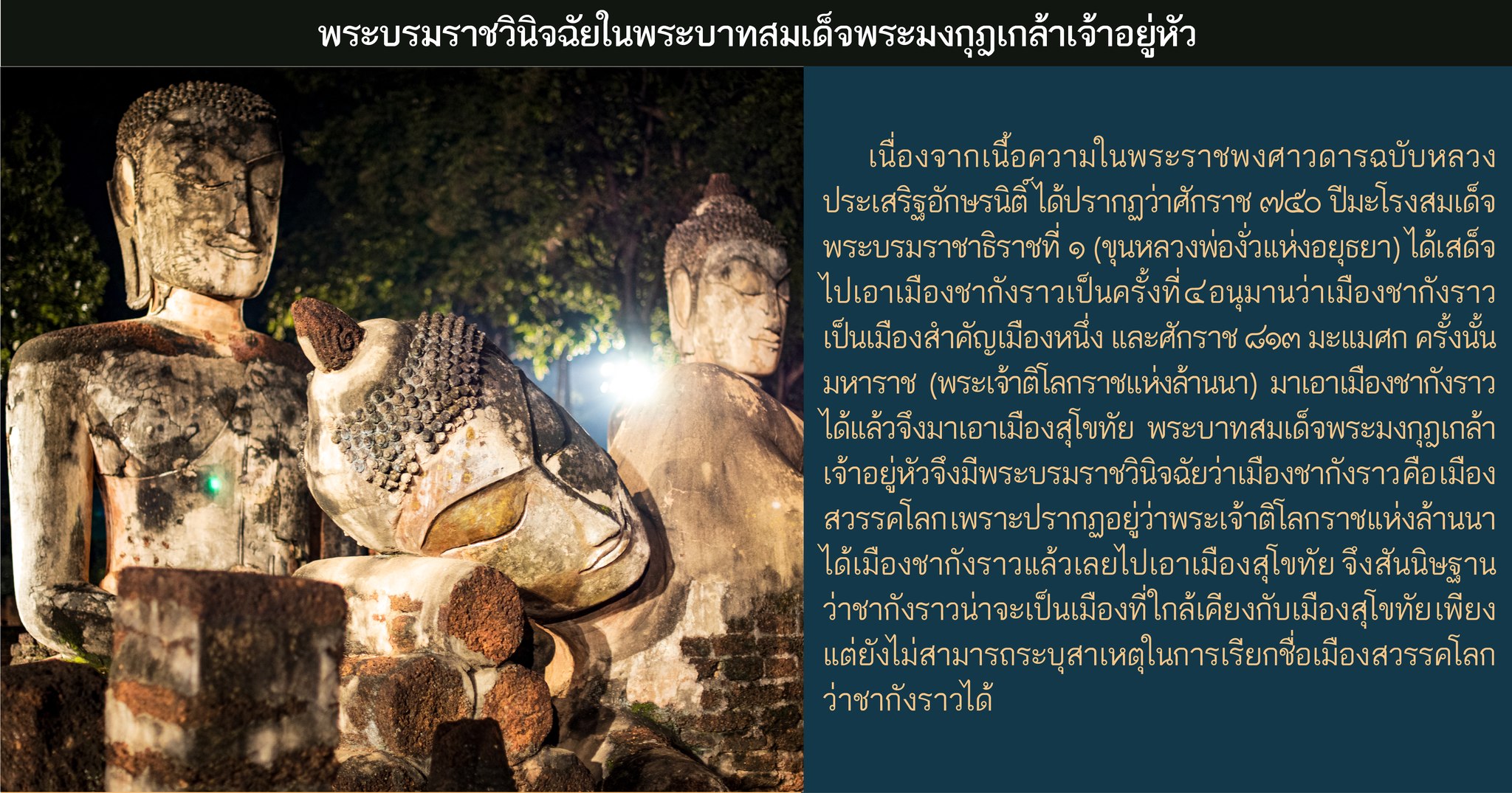 พระบาทสมเด็จพระมงกุฏเกล้าเจ้าอยู่หัวทรงพระบรมราชวินิจฉัยเกี่ยวกับเมืองชากังราวไว้ในพระราชนิพนธ์เที่ยวเมืองพระร่วง ดังนี้
