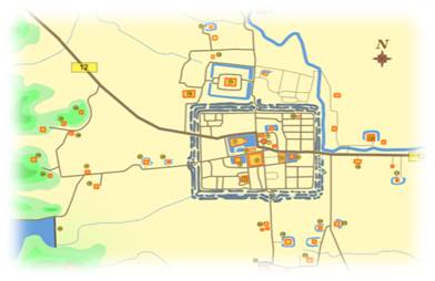 Øเขตภายในกำแพงเมือง ๕๐๓ ไร่ มีโบราณสถานประมาณ ๑๙ แห่ง โบราณสถานที่สำคัญ ได้แก่ วัดพระแก้ว วัดพระธาตุ เขตวังโบราณ(สระมน) ศาลพระอิศวร กำแพงเมือง คูเมืองและป้อมประตูต่างๆ