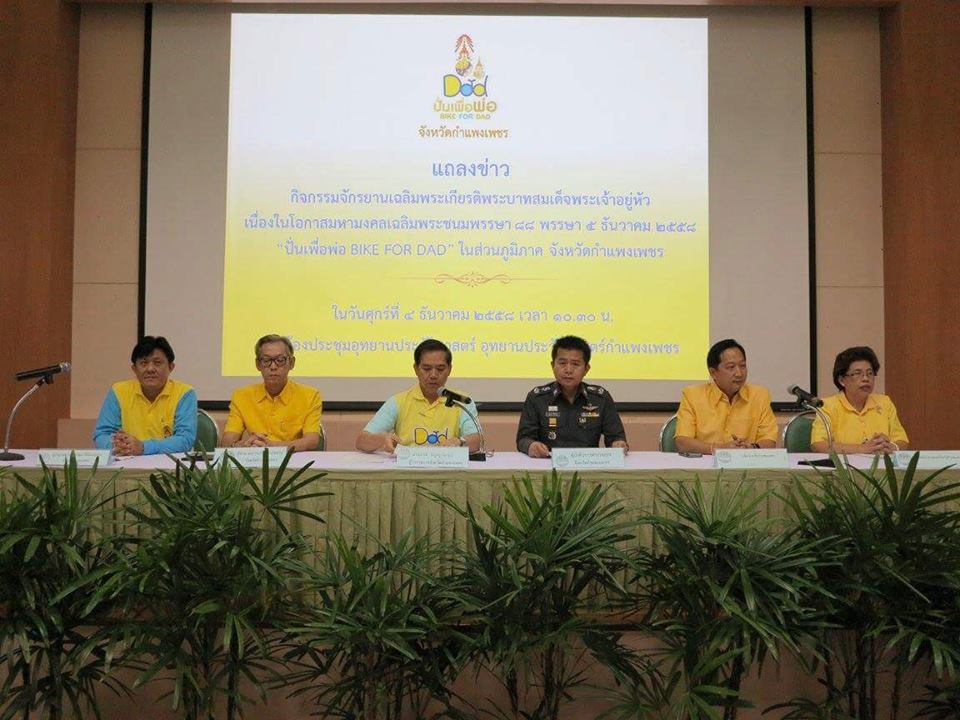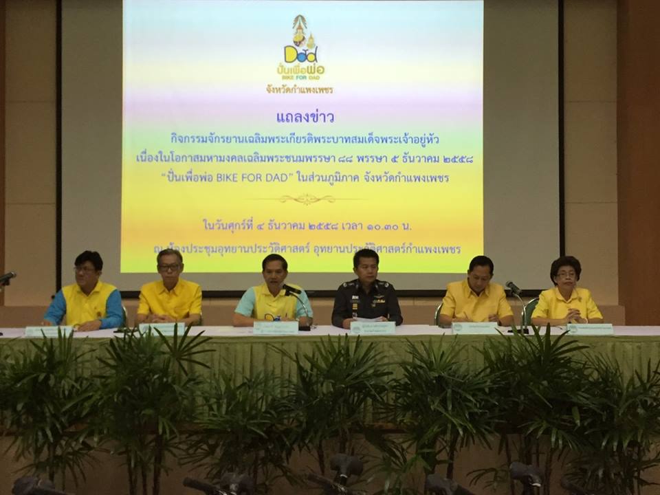 ๔ ธันวาคม ๒๕๕๘ เวลา ๑๐.๓๐ น. จังหวัดกำแพงเพชรจัดแถลงข่าวการกิจกรรมจักรยานเฉลิมพระเกียรติพระบาทสมเด็จพระเจ้าอยู่หัว "ปั่นเพื่อพ่อ BIKE FOR DAD" โดยนายธานี ธัญญาโภชน์ ผู้ราชการจังหวัดกำแพงเพชร ปลัดจังหวัดกำแพงเพชร ผู้บังคับการตำรวจภูธรจังหวัดกำแพงเพชร นายแพทย์สาธารณสุขจังหวัดกำแพงเพชร ผู้อำนวยการศูนย์พัฒนาฝีมือแรงงานจังหวัดกำแพงเพชร ร่วมขึ้นแถลงข่าว มีนายนลิน ตั้งประสิทธิ์ นายรุ่งชัย ใบกว้าง รองผู้ว่าราชการจังหวัดกำแพงเพชร นางธาดา สังข์ทอง หัวหน้าอุทยานประวัติศาสตร์กำแพงเพชร หัวหน้าราชการ ผู้ร่วมปั่นเพื่อพ่อ และผู้สื่อข่าวจังหวัดกำแพงเพชร ร่วมรับฟังการแถลงข่าว ณ ห้องประชุมอุทยานประวัติศาสตร์กำแพงเพชร
