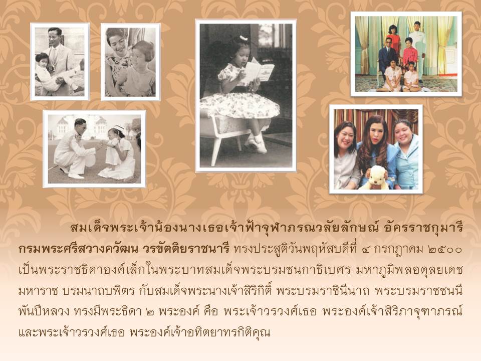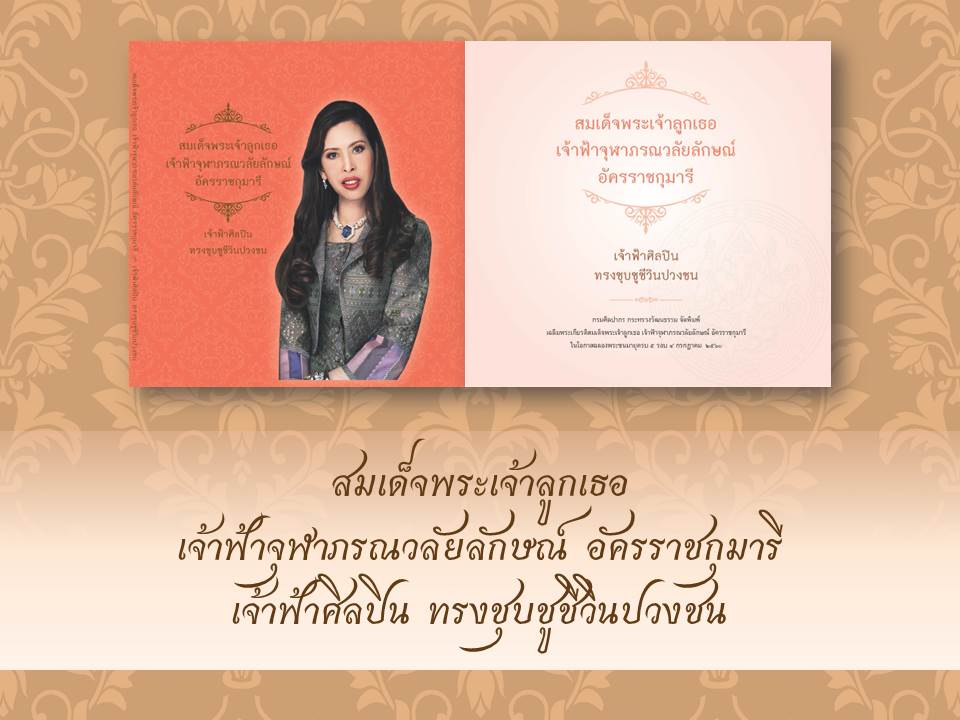แนะนำหนังสือเกี่ยวกับพระราชประวัติ และพระราชกรณียกิจด้านต่าง ๆ ในสมเด็จพระเจ้าน้องนางเธอ เจ้าฟ้าจุฬาภรณ์วลัยลักษณ์ อัครราชกุมารี กรมพระศรีสวางควัฒน วรขัตติยราชนารี ชื่อเรื่อง สมเด็จพระเจ้าลูกเธอ เจ้าฟ้าจุฬาภรณวลัยลักษณ์ อัครราชกุมารี เจ้าฟ้าศิลปิน ทรงชุบชูชีวินปวงชน กรมศิลปากรจัดพิมพ์เนื่องในโอกาสฉลองพระชนมายุครบ ๕ รอบ ๖๐ พรรษา ๔ กรกฎาคม ๒๕๖๐
