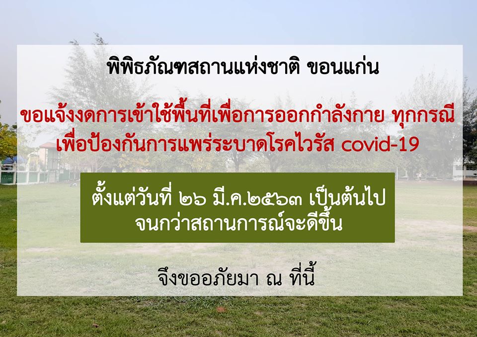 ขอแจ้งงดการเข้าใช้พื้นที่เพื่อการออกกำลังกาย ทุกกรณี เพื่อป้องกันการแพร่ระบาดโรคไวรัส covid-19
