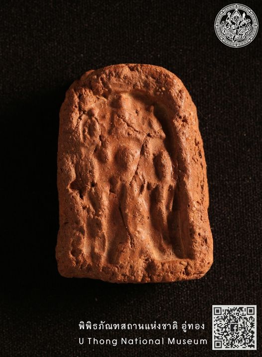 พระพิมพ์ดินเผาภาพพระพุทธเจ้าขนาบข้างด้วยรูปบุคคล สมัยทวารวดี