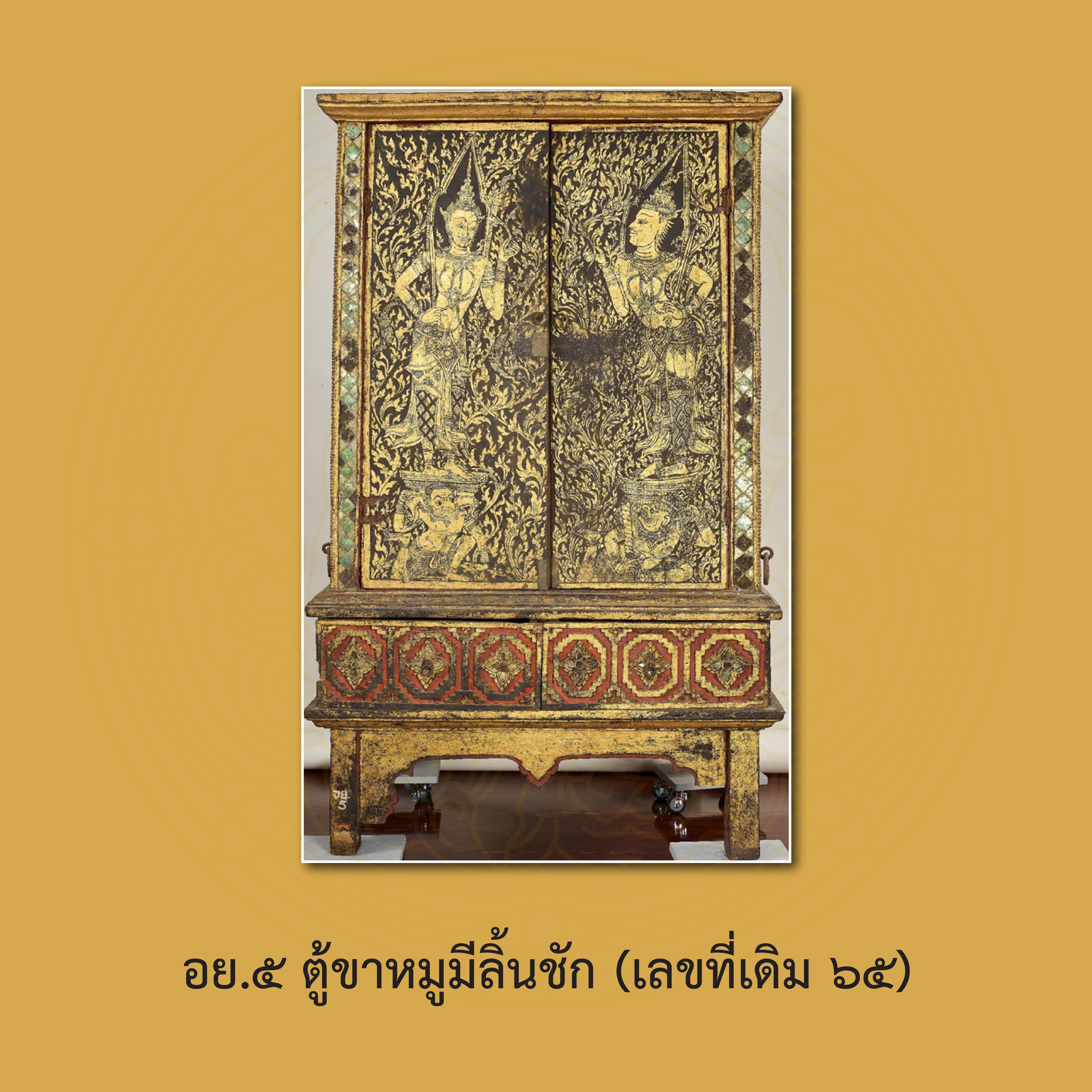 ลักษณะลาย : ตู้ลายรดน้ำ ภาพเทพทวารบาล และลายกนกเปลวเครือเถา
