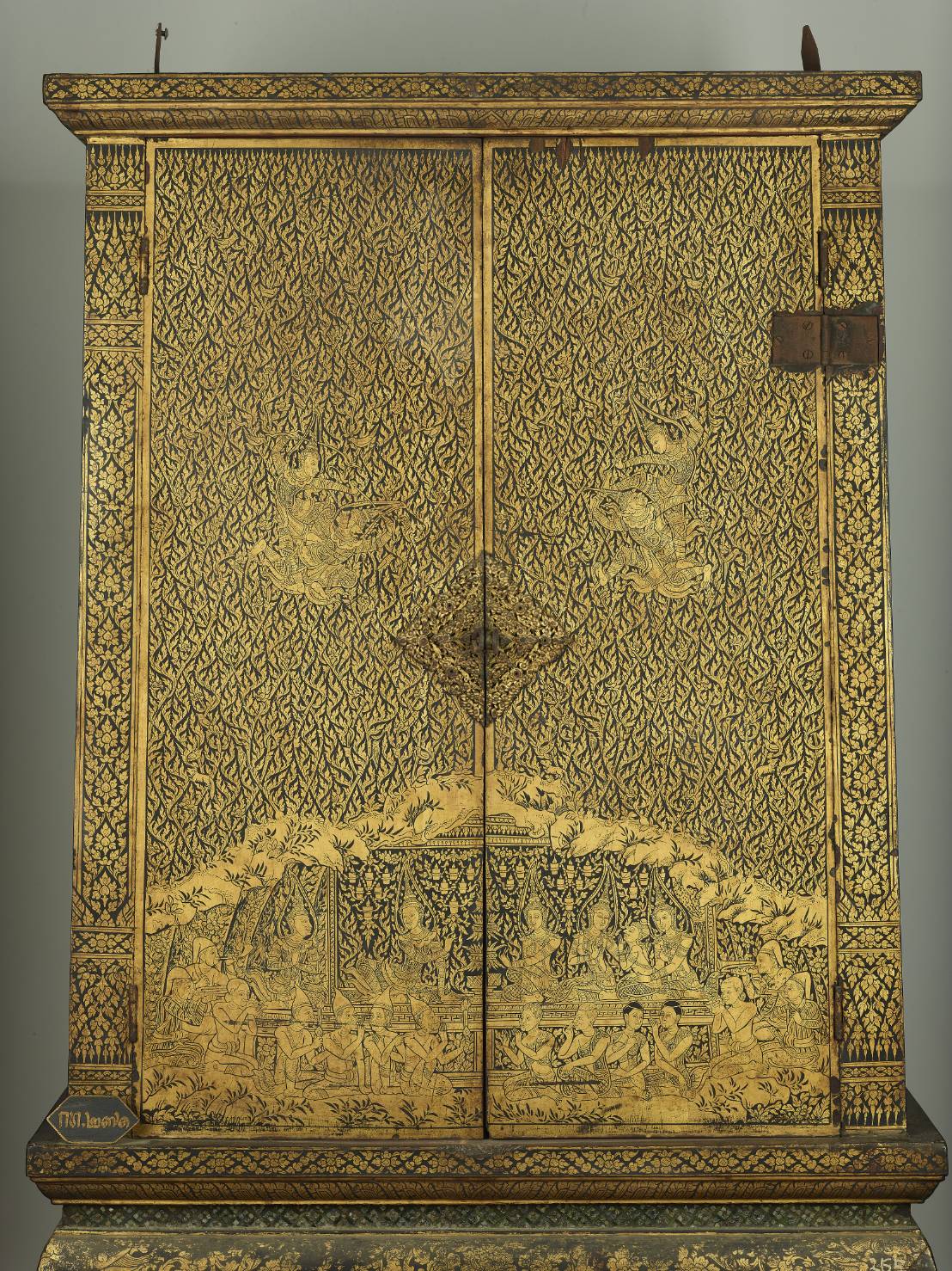 Manuscript Cabinet on bent-legged stand with a one to-one fighting scene and scenes from the Mahosatha jataka, garuda's and naga's heads biting the stems, garuda's head, naga's head and figures of animals, birds, squirrels, monkeys and a trellis of flame motif