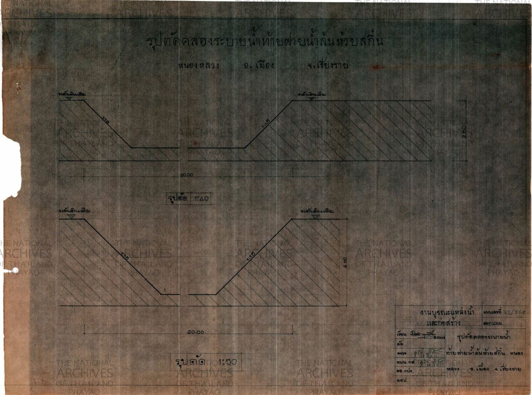 หอจดหมายเหตุแห่งชาติเฉลิมพระเกียรติฯ พะเยา. เอกสารสถานีประมงน้ำจืดจังหวัดพะเยา ผจ (2) กษ 1/2 แบบรูปตัดคลองระบายน้ำท้ายฝายน้ำล้นห้วยสกึ๋น หนองหลวง อำเภอเมือง จังหวัดเชียงราย [26 ก.พ. 2519]