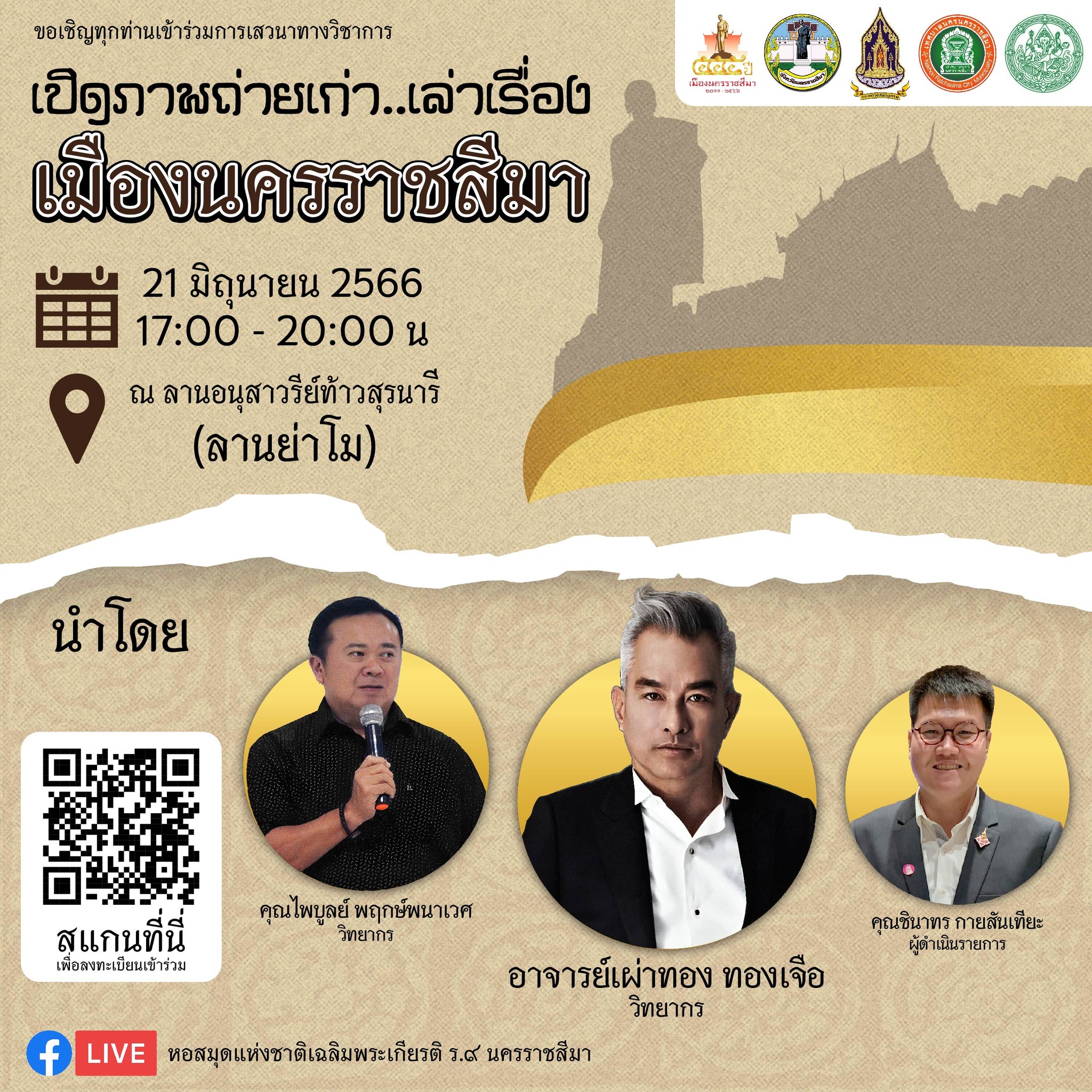 หอสมุดแห่งชาติเฉลิมพระเกียรติ ร.๙ นครราชสีมา สำนักศิลปากรที่ ๑๐ นครราชสีมา ในความร่วมมือกับ เทศบาลนครนครราชสีมา จังหวัดนครราชสีมา และสำนักงานวัฒนธรรมจังหวัดนครราชสีมา ขอเชิญทุกท่านเข้าร่วมฟังการเสวนาทางวิชาการ “เปิดภาพถ่ายเก่า..เล่าเรื่องเมืองนครราชสีมา” ณ ลานอนุสาวรีย์ท้าวสุรนารี ในวันพุธที่ ๒๑ มิถุนายน พุทธศักราช ๒๕๖๖ เวลา ๑๗.๐๐ – ๒๐.๐๐น. โดยวิทยากร อาจารย์เผ่าทอง ทองเจือ ผู้เชี่ยวชาญด้านประวัติศาสตร์ โบราณคดี ผ้าไทย ความรู้เกี่ยวกับราชสำนัก และนายไพบูลย์ พฤกษ์พนาเวศ ที่ปรึกษานายกเทศมนตรี เทศบาลนครนครราชสีมา ผู้ดำเนินรายการ นายชินาทร กายสันเทียะ ผู้อนุรักษ์มรดกไทยดีเด่น พุทธศักราช ๒๕๖๐