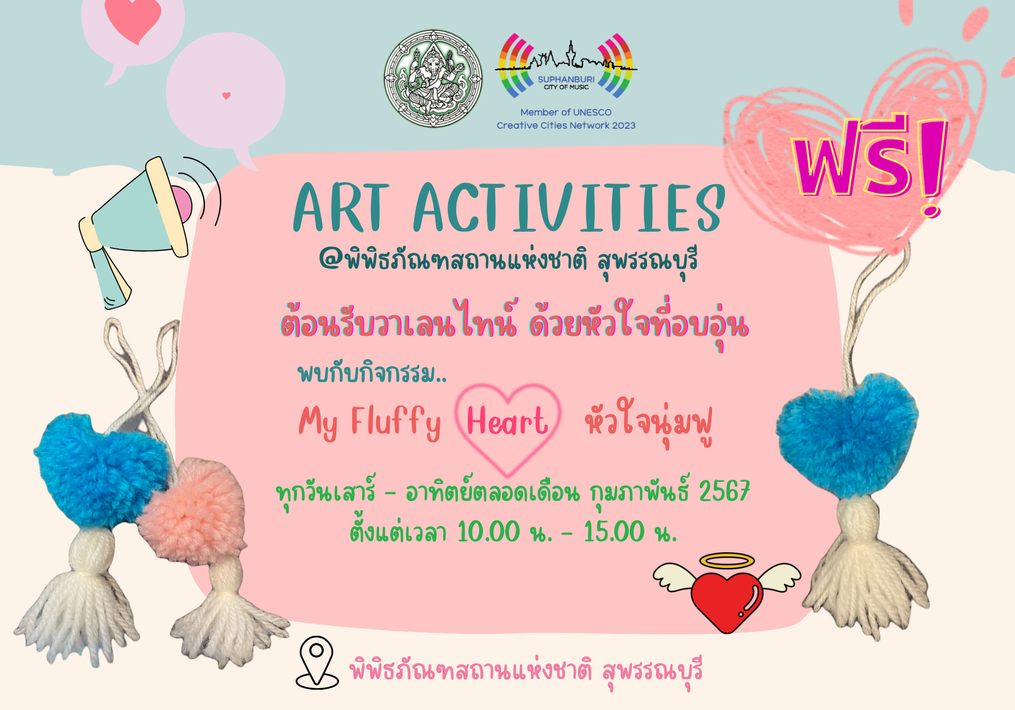 พิพิธภัณฑสถานแห่งชาติสุพรรณบุรี จัดกิจกรรม Art Activities @พิพิธภัณฑสถานแห่งชาติ สุพรรณบุรี ขอเชิญร่วมต้อนรับวาเลนไทน์ด้วยหัวใจที่อบอุ่น พบกับกิจกรรม "My Fluffy Heart หัวใจนุ่มฟู” ประดิษฐ์พวงกุญแจสานรักจากไหมพรม เพื่อส่งเสริมความรักความอบอุ่นในครอบครัวด้วยการทำกิจกรรมร่วมกัน ในทุกวันเสาร์ - อาทิตย์ เวลา 10.00 น. - 15.00 น. ตลอดเดือนกุมภาพันธ์ 2567 ณ ห้องกิจกรรมพิเศษ ชั้น 2 พิพิธภัณฑสถานแห่งชาติ สุพรรณบุรี ทั้งนี้ น้อง ๆ ที่เข้าร่วมกิจกรรม จะได้รับผลงานกลับบ้านไปด้วย สอบถามเพิ่มเติมได้ทาง Facebook : พิพิธภัณฑสถานแห่งชาติ สุพรรณบุรี Suphanburi National Museum หรือ โทร. 0 3553 5330
