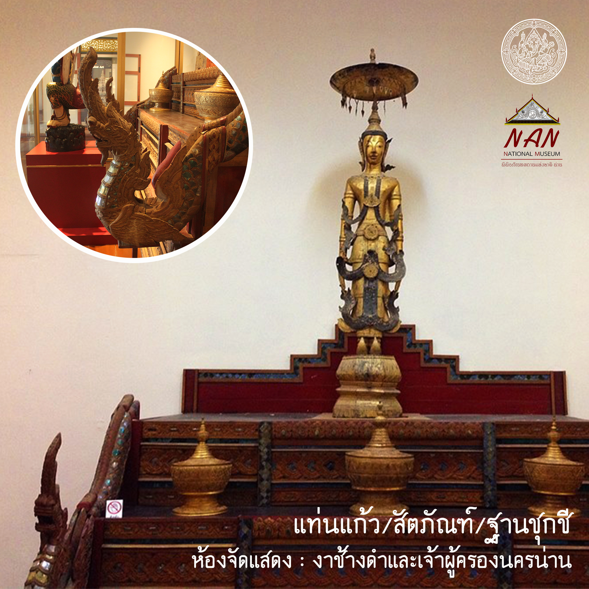 ลักษณะของแท่นฐานที่จัดแสดงในพิพิธภัณฑสถานแห่งชาติน่านในปัจจุบัน เป็นลักษณะแท่นไม้ ๒ ชั้น แบบขั้นบันได ประดับตกแต่งด้วยไม้แกะสลัก ทาสี ติดกระจก ด้านข้างตกแต่งด้วยพญานาคขนาบทั้ง ๒ ข้าง ส่วนกลางลำตัวถึงหางหายไป โดยจากภาพถ่ายเก่าสูงขึ้นไปเป็น ๕ ชั้น