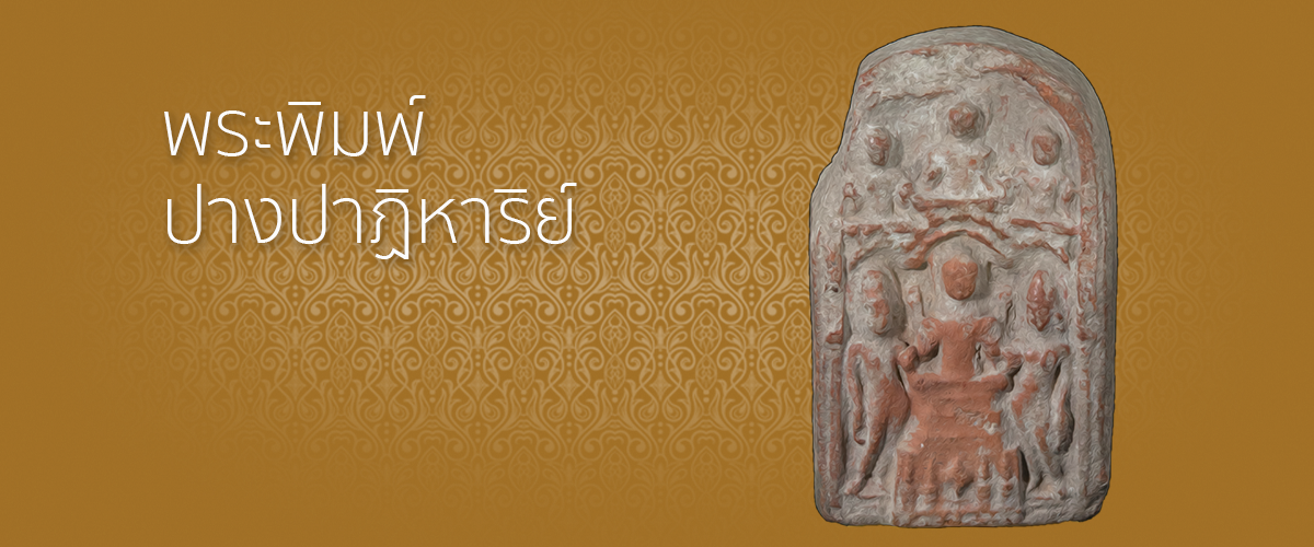 ลักษณะ : พระพิมพ์แสดงเหตุการณ์พระพุทธเจ้าแสดงปาฏิหาริย์ ประกอบด้วยพระพุทธเจ้าประทับนั่งขัดสมาธิบนฐานสูง ด้านหน้าฐานมีธรรมจักรและสถูป ขนาบด้วยบุคคลทั้ง 2 ข้าง อาจเป็นพระโพธิสัตว์ ด้านบนมีพระพุทธเจ้าประทับนั่งขัดสมาธิ 3 องค์