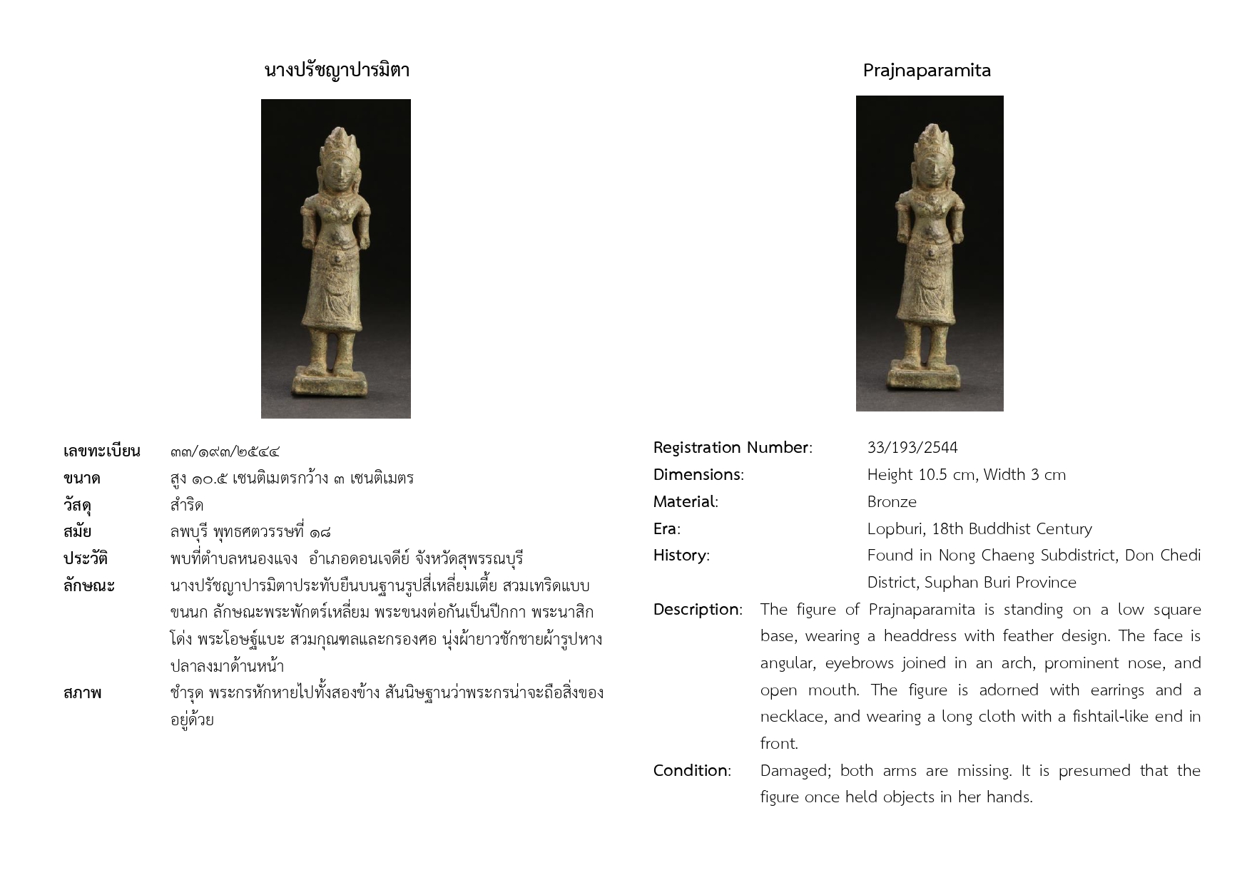 โบราณวัตถุที่นำมาจัดแสดงในนิทรรศการครั้งนี้ ได้แก่ "นางปรัชญาปารมิตา" เป็นสำริด สมัยลพบุรี พุทธศตวรรษที่ ๑๘ ขนาดยาว ๑๐.๕ เซนติเมตร กว้าง ๓ เซนติเมตร ลักษณะนางปรัชญาปารมิตาประทับยืนบนฐานรูปสี่เหลี่ยม สวมเทริดแบบขนนก พระพักตร์เหลี่ยม พระขนงต่อกันเป็นปีกกา พระนาสิกโด่ง พระโอษฐ์แบะ สวมกุณฑลและกรองค้อ นุ่งผ้ายาวชักชายผ้ารูปหางปลาลงมาด้านหน้า สภาพชำรุด พระกรหักหายไปทั้งสองข้าง สันนิษฐานว่าพระกรน่าจะถือสิ่งของอยู่ด้วย พบที่ตำบลหนองแจง อำเภอดอนเจดีย์ จังหวัดสุพรรณบุรี นิทรรศการให้ความรู้เกี่ยวกับนางปรัชญาปารมิตา สุพรรณภูมิกับอิทธิพลขอมโบราณ รัตนตรัยมหายาน และเมืองโบราณบ้านหนองแจง