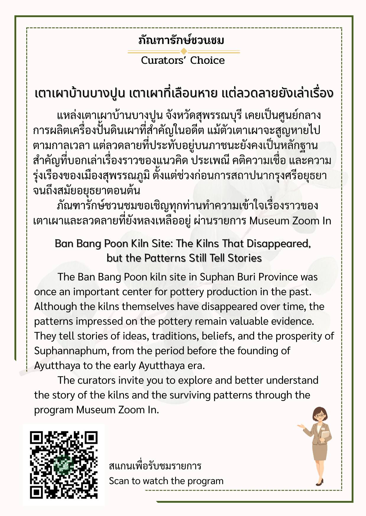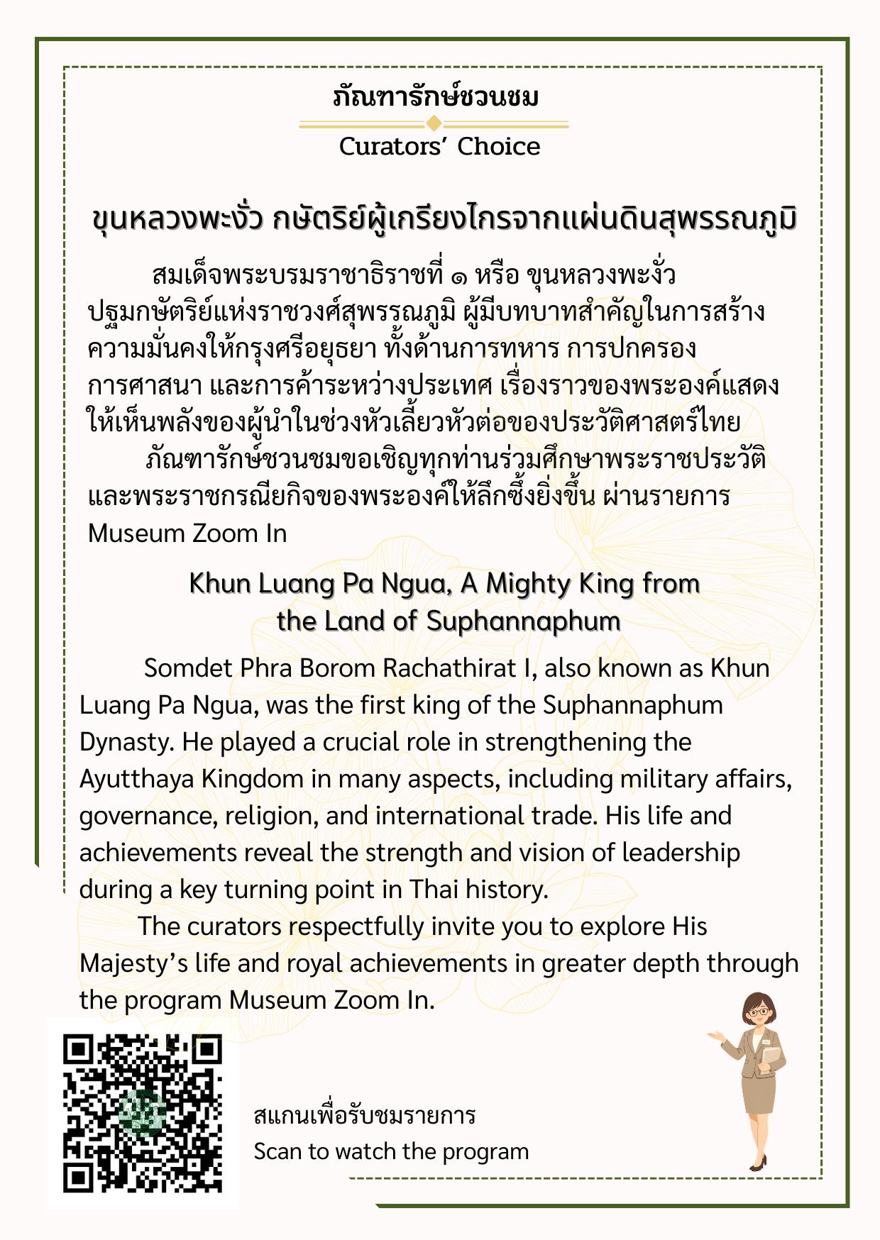 พิพิธภัณฑสถานแห่งชาติ สุพรรณบุรี ขอเชิญชวนทุกท่านมาทำความรู้จักกับโบราณวัตถุและเรื่องราวสำคัญที่ภัณฑารักษ์คัดเลือกมาเป็นพิเศษ ผ่านกิจกรรม “ภัณฑารักษ์ชวนชม (Curators’ Choice)” ผู้ชมสามารถสแกน QR Code เพื่อรับฟังคำอธิบายเพิ่มเติมผ่านรายการ Museum Zoom In แล้วคุณอาจค้นพบว่า วัตถุชิ้นเดิมที่เคยเดินผ่านนั้น มีเรื่องราวมากกว่าที่คิด มาร่วมค้นพบเรื่องเล่าจากวัตถุไปพร้อมกัน ณ พิพิธภัณฑสถานแห่งชาติ สุพรรณบุรี สอบถามเพิ่มเติม โทร. 0 3553 6100 Facebook พิพิธภัณฑสถานแห่งชาติ สุพรรณบุรี Suphanburi National Museum