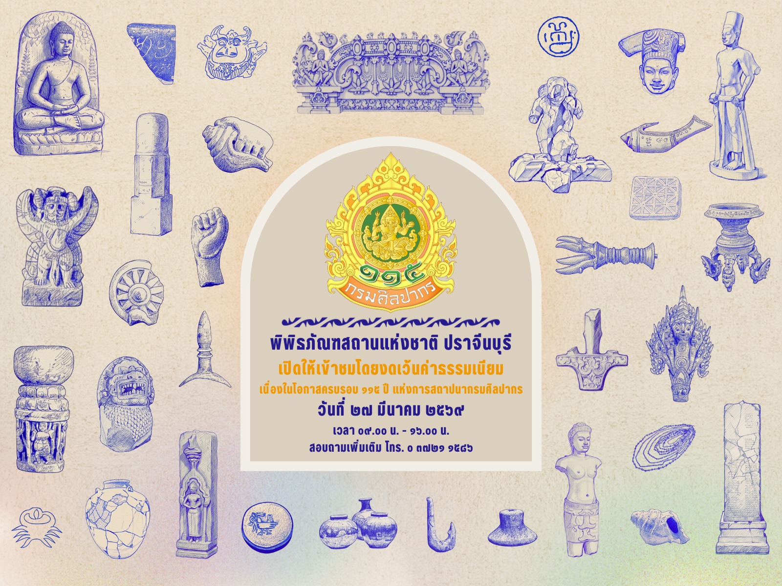 กรมศิลปากร ขอเชิญชวนประชาชนร่วมเฉลิมฉลองเนื่องในโอกาสวันคล้ายวันสถาปนากรมศิลปากร ครบรอบ 115 ปี เปิดให้เข้าชมอุทยานประวัติศาสตร์ พิพิธภัณฑสถานแห่งชาติ และโบราณสถานที่ได้ขึ้นทะเบียนแล้วทั่วประเทศ ทั้งชาวไทยและชาวต่างชาติ โดยไม่เสียค่าธรรมเนียมเข้าชม ในวันศุกร์ที่ 27 มีนาคม 2569 เวลา 09.00 – 16.00 น. ไปร่วมเรียนรู้และภาคภูมิใจในมรดกทางวัฒนธรรมอันล้ำค่าของชาติในโอกาสพิเศษนี้-------------------------------------------
