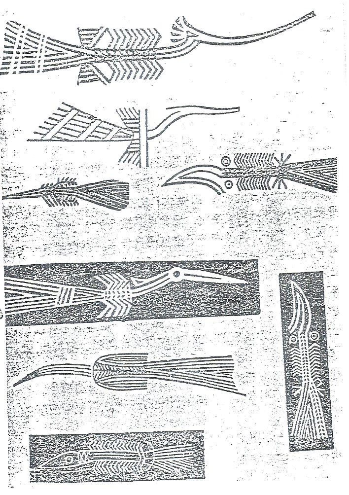 2. ลายนกบิน เป็นลายรูปสัตว์ที่สำคัญลายหนึ่งที่พบบนหน้ากลองมโหระทึก ลายนกบินที่พบส่วนใหญ่จะมีหลายตัวตั้งแต่ 4 ตัวขึ้นไป สัญนิษฐานว่าลายนกบินนั้นอาจหมายถึงนกส่งวิญญาณตามความเชื่อของกลุ่มชน คือใช้ในการประกอบพิธีกรรมเกี่ยวกับความตาย