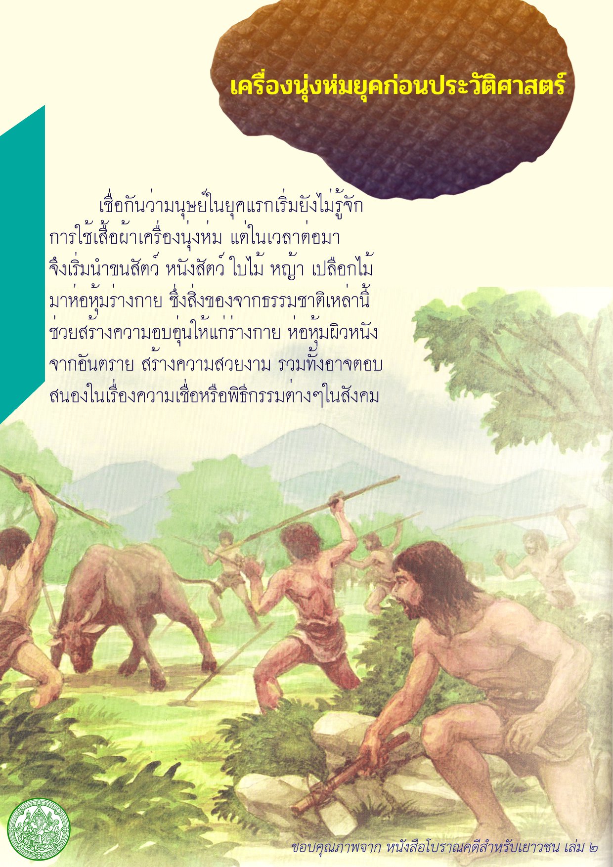 เชื่อกันว่ามนุษย์ในยุคแรกเริ่มยังไม่รู้จักการใช้เสื้อผ้าเครื่องนุ่งห่ม แต่ในเวลาต่อมาจึงเริ่มนำขนสัตว์ หนังสัตว์ ใบไม้ หญ้า เปลือกไม้ มาห่อหุ้มร่างกาย ซึ่งสิ่งของจากธรรมชาติเหล่านี้ช่วยสร้างความอบอุ่นให้แก่ร่างกาย ห่อหุ้มผิวหนังจากอันตราย สร้างความสวยงาม รวมทั้งอาจตอบสนองในเรื่องความเชื่อหรือพิธีกรรมต่างๆในสังคม