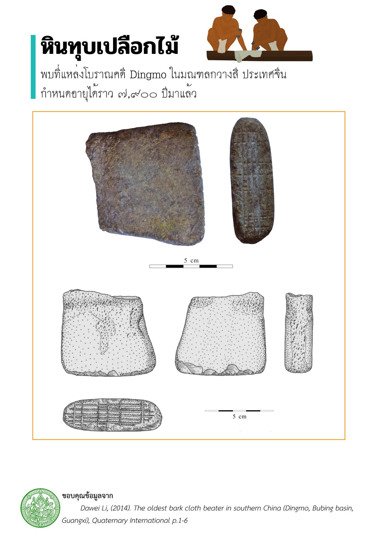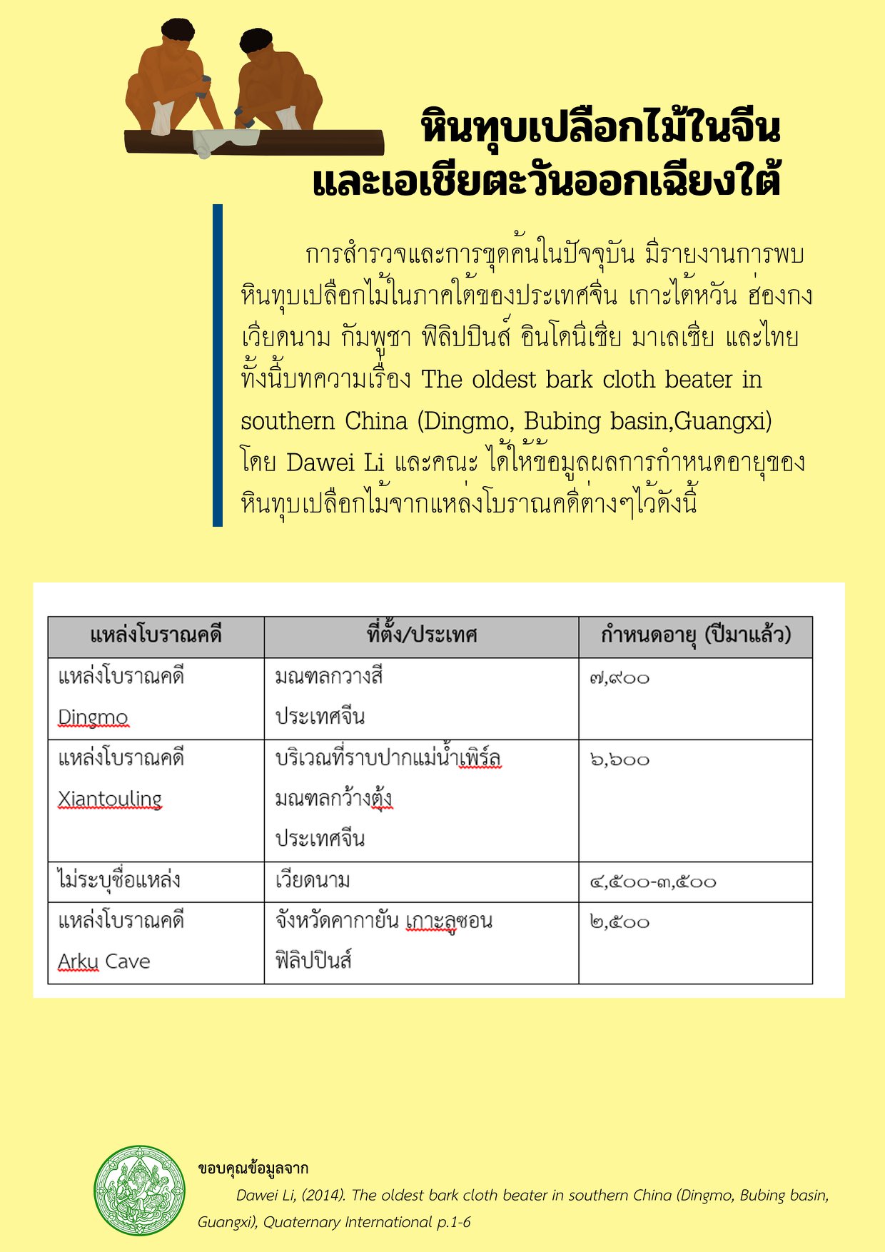 ทั้งนี้บทความเรื่อง The oldest bark cloth beater in southern China (Dingmo, Bubing basin,Guangxi) โดย Dawei Li และคณะ ได้ให้ข้อมูลผลการกำหนดอายุของหินทุบเปลือกไม้จากแหล่งโบราณคดีต่างๆไว้ดังนี้