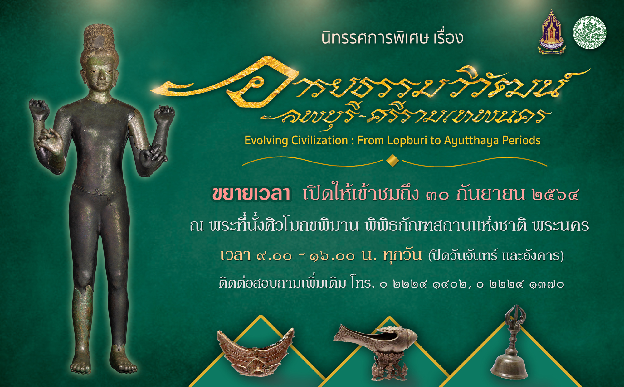 กรมศิลปากร ขยายเวลาจัดแสดงนิทรรศการพิเศษ เรื่อง “อารยธรรมวิวัฒน์ ลพบุรี – ศรีราม เทพนคร” ณ พระที่นั่งศิวโมกขพิมาน พิพิธภัณฑสถานแห่งชาติ พระนคร ถึงวันที่ ๓๐ กันยายน ๒๕๖๔
