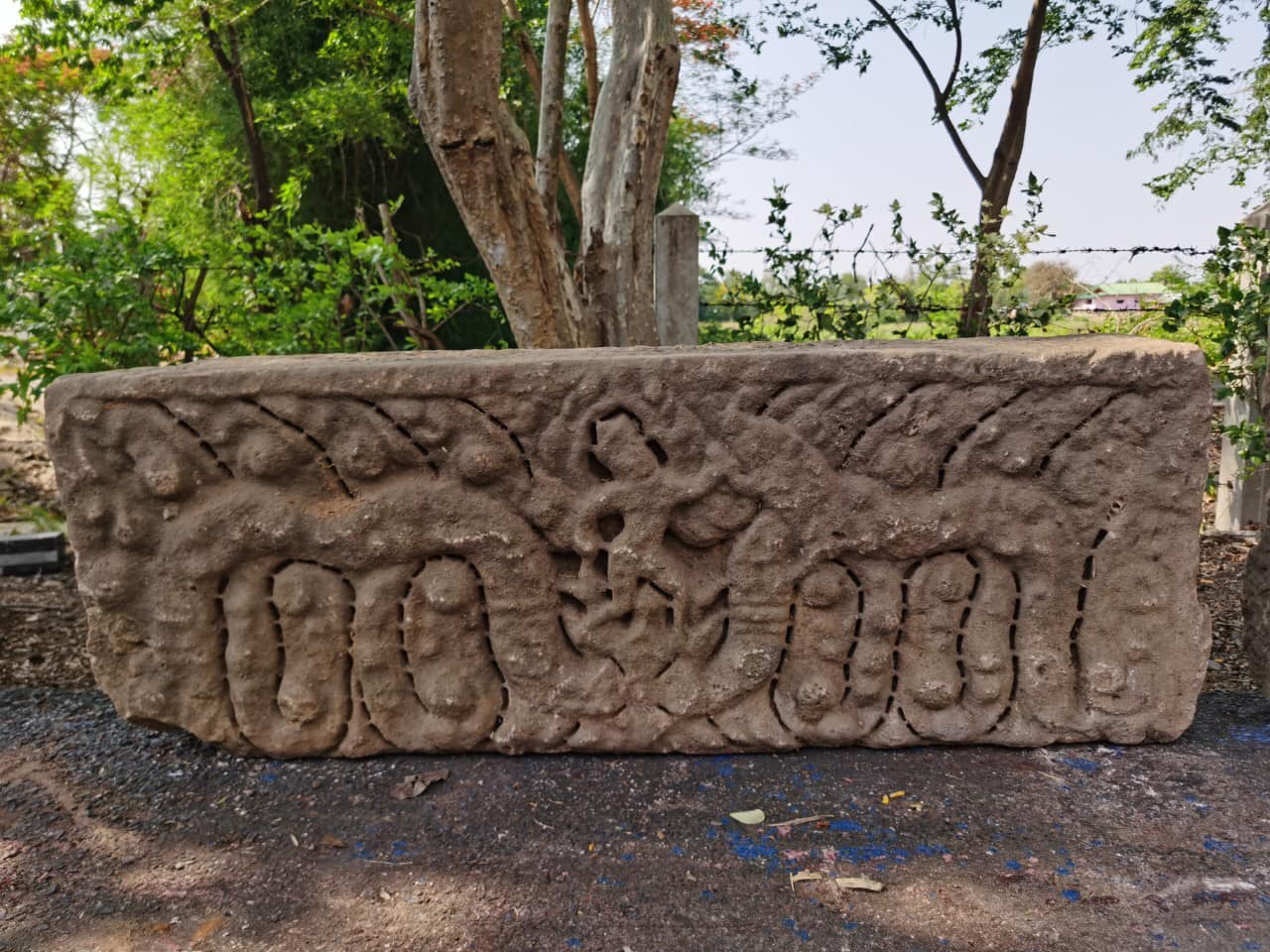 2. #ทับหลังสลักภาพลายท่อนพวงมาลัย ภาพตรงกลางกะเทาะหายไป พบบริเวณกริด 11I (พบบริเวณลานด้านหน้าฐานไพทีของปราสาทหลังทิศเหนือ) จำนวน 1 ชิ้น กำหนดอายุในราวช่วงครึ่งหลัง พุทธศตวรรษที่ 16